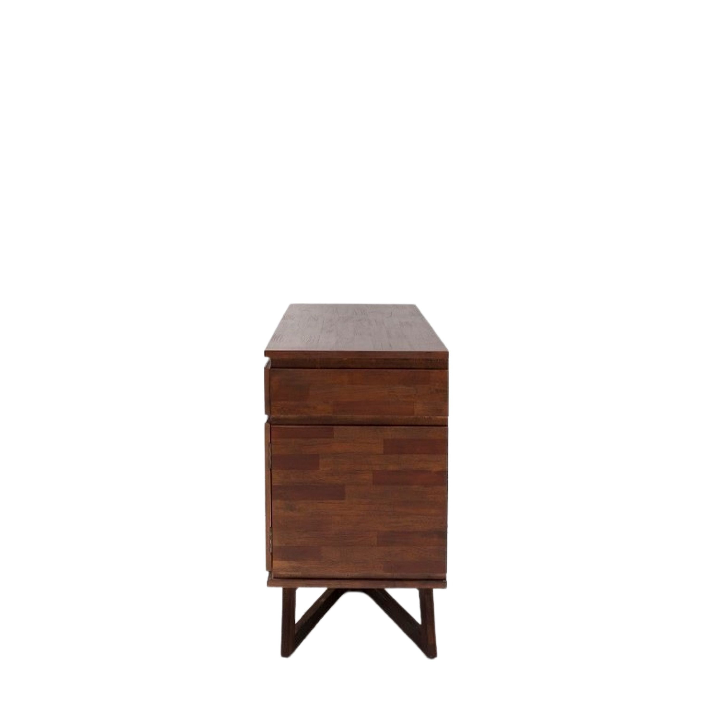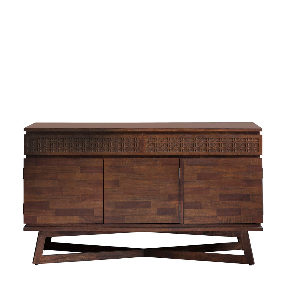 Made from solid mango wood with mindi, teak, and mahogany veneers with a rich brown finish, it features a striking inlaid pattern that exudes timeless sophistication. Intricately carved drawer fronts add an artistic flair, while the sleek crossover legs provide a modern, architectural touch. With two drawers and three doors opening to spacious shelved storage, it’s as practical as it is beautiful.