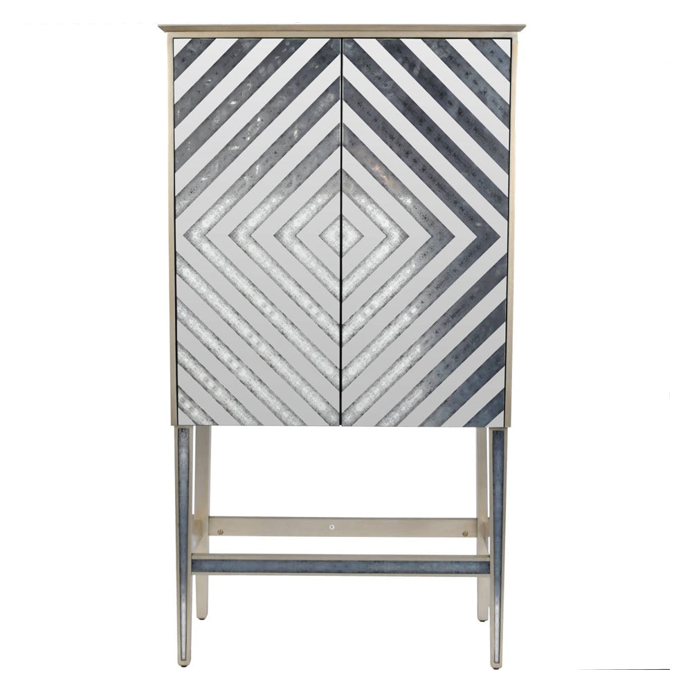 This unique cabinet boasts a wooden frame with a luxurious champagne gold finish, beautifully complemented by antiqued mirror panels on the sides. It also features clear and antiqued mirror inserts on the door which have been arranged in an elegant chevron pattern. Supported by four sturdy legs connected by a sleek frame, this cabinet ensures stability and style. Inside, two toughened glass shelves offer ample storage for your spirits and accessories, while suspended wine glass racks provide a practical and sophisticated touch.