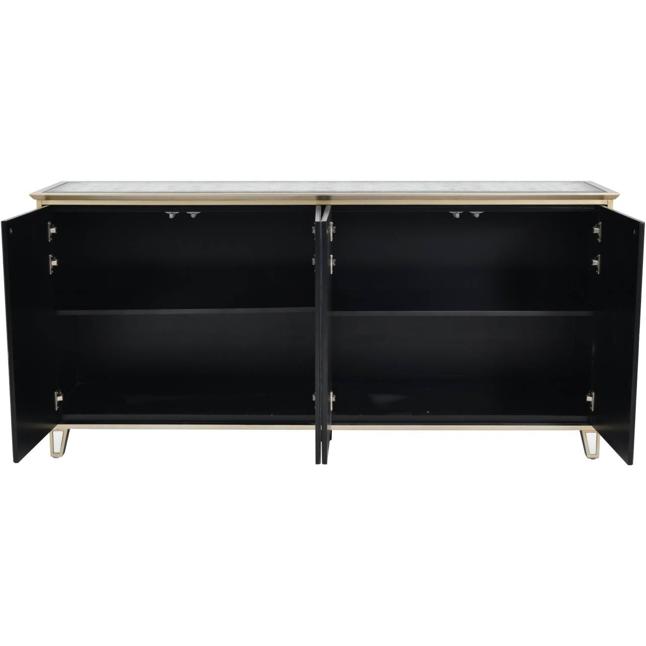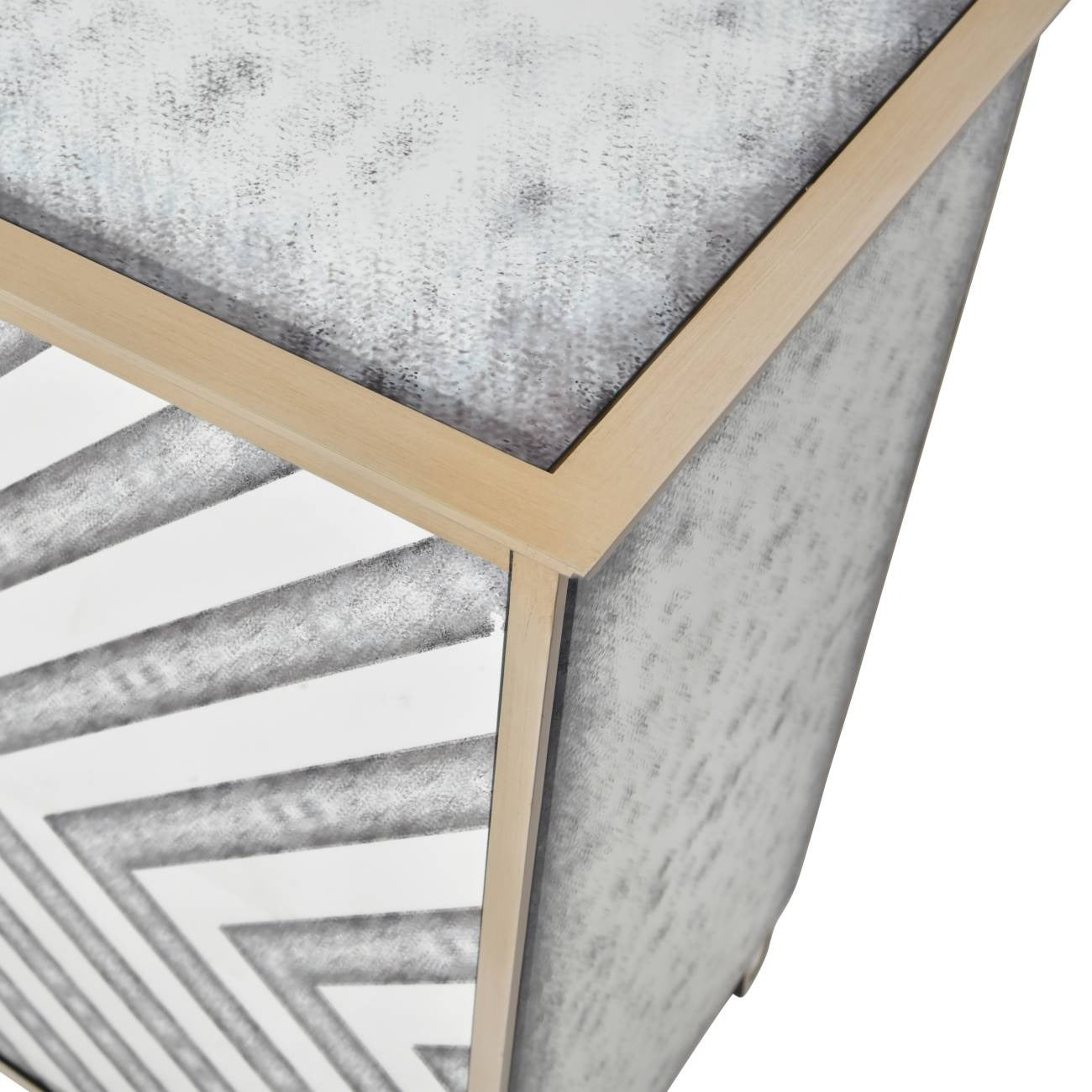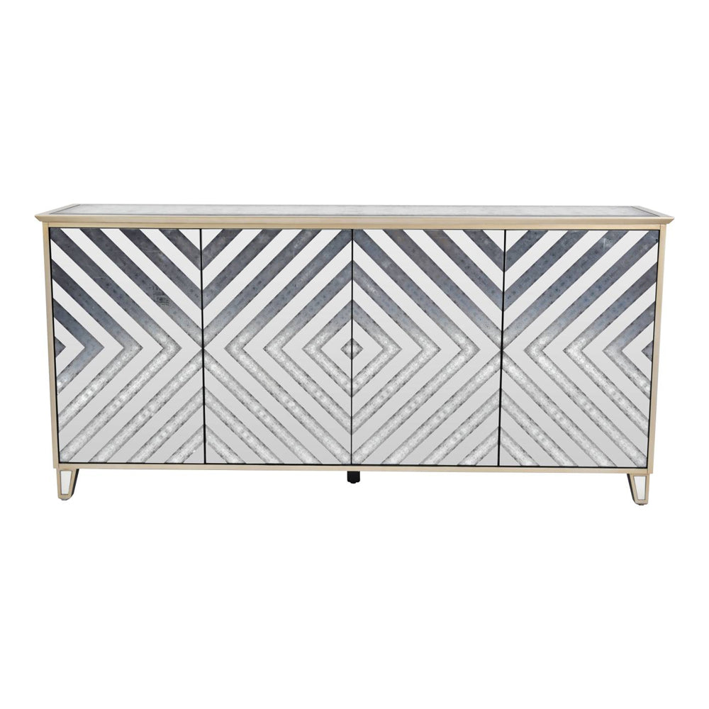 This chunky unit captivates with its wooden frame which has been finished in antique gold paint to providing a rich backdrop for the antiqued mirror panels that adorn its sides and top. The front of the sideboard features a stylish blend of clear and antiqued mirror inserts, arranged in a striking chevron pattern across its four doors to add depth and texture to its appearance. Inside, the sideboard boasts two removable and adjustable shelves to cater to your storage needs with ease.