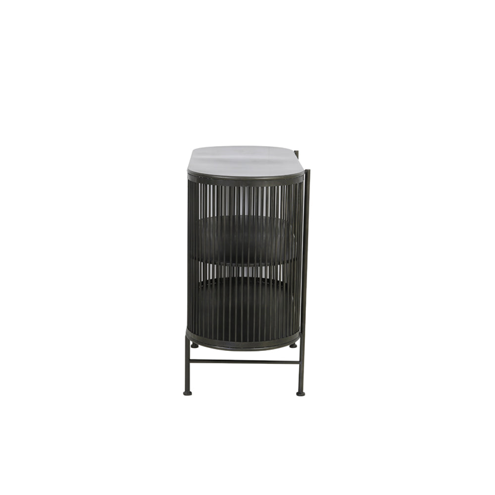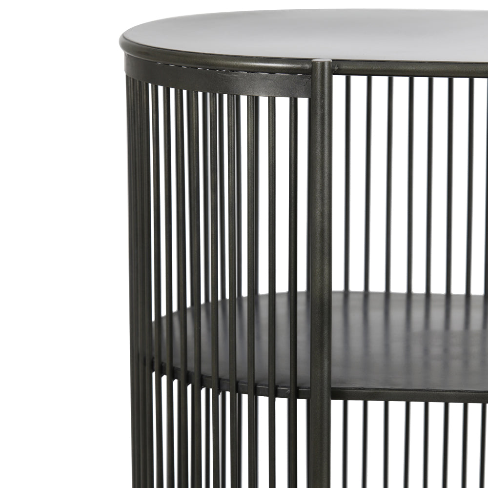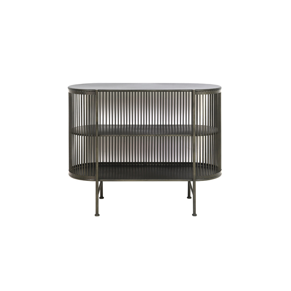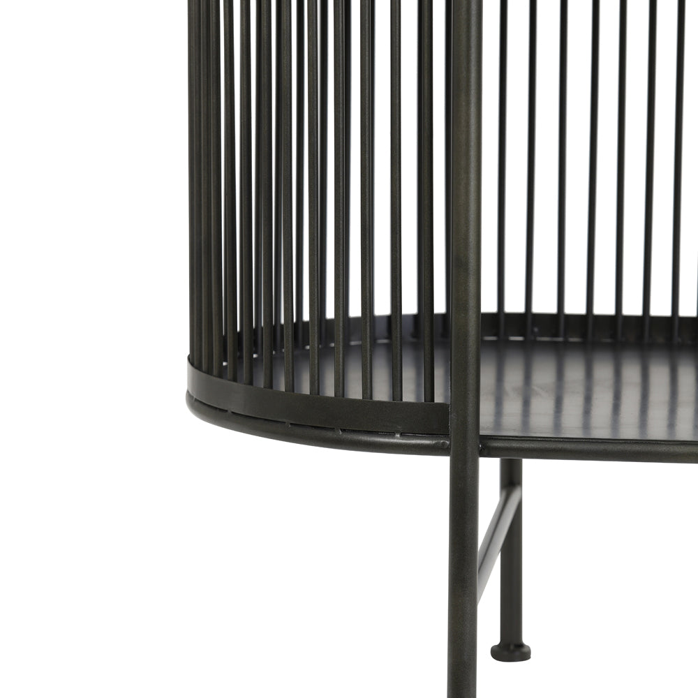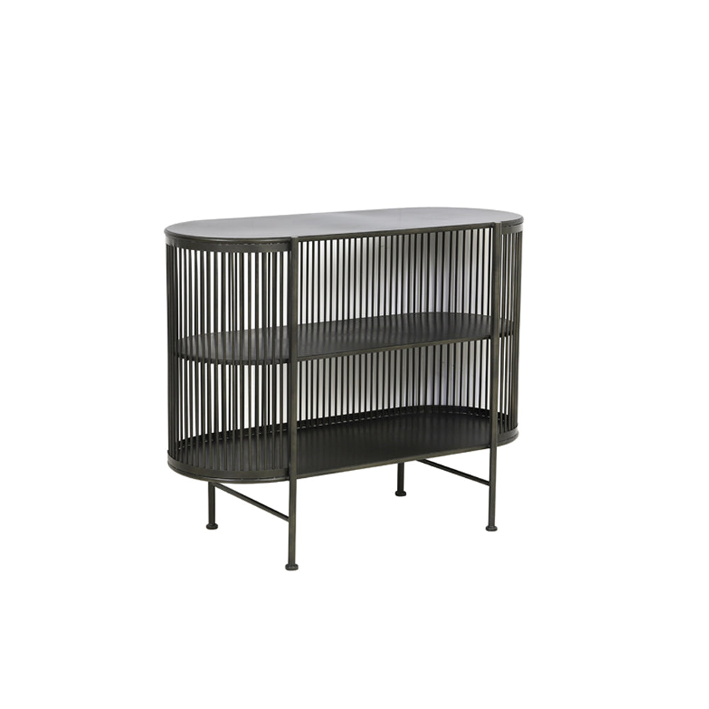 Contemporary elegance with a hint of industrial charm, the Yinthe Open Cabinet brings convenient style front and centre. With a slatted frame made from black metal, this oval cabinet remains open at the front to provide a clear view of any ornaments and photographs you choose to display on it and with two levels of shelving and a spacious top, there is plenty of room for all of your favourites. In your living room, dining room, or hallway, its minimalistic chic makes for a striking display cabinet as part of any design scheme. A classy cabinet for sophisticated interiors.