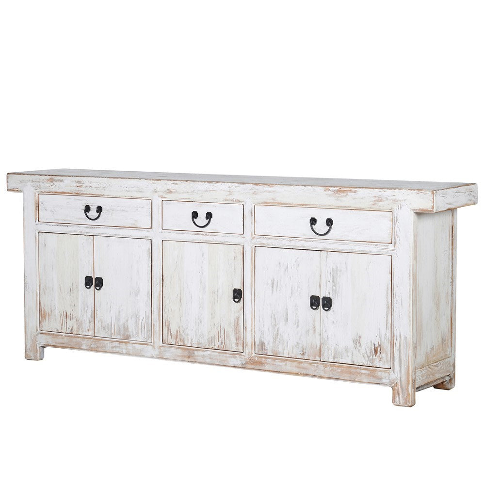 Crafted from reclaimed oak, it boasts a powerful presence and has the added benefit of being sustainable. It features five doors and convenient shelving in addition to three drawers, so you can rest assured that you will be getting plenty of storage space. A distressed white finish and old-fashioned metal handles complete the design with a rustic flair.