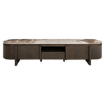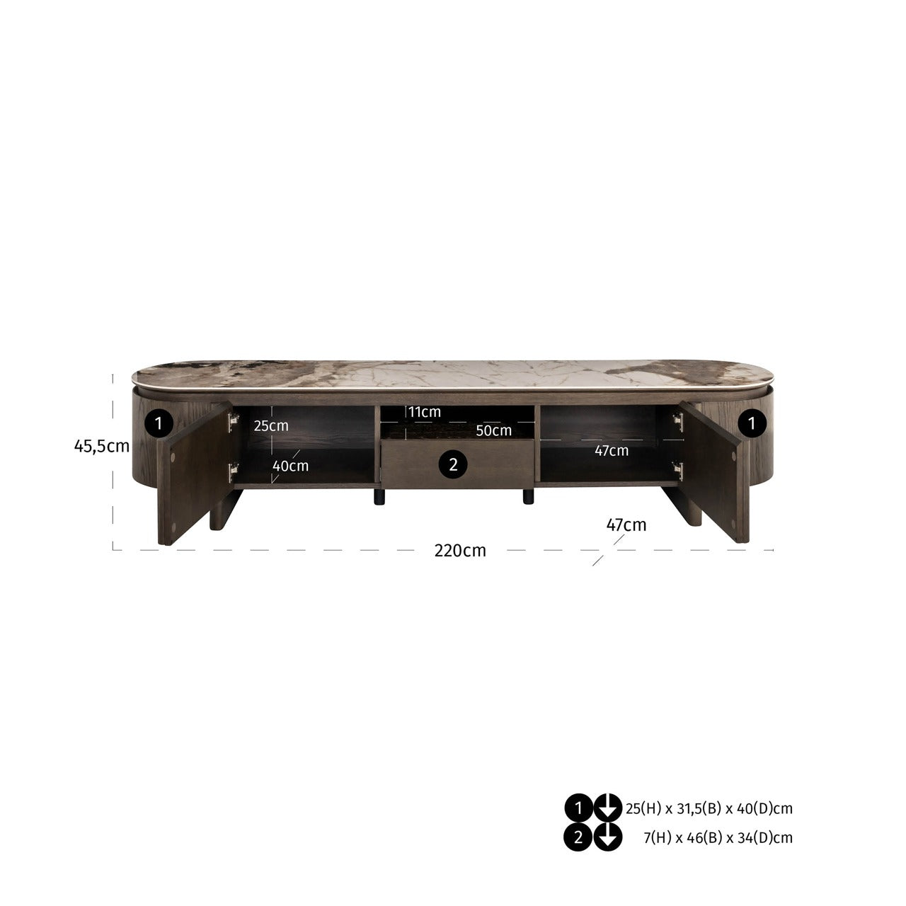 This elegant piece combines sustainable materials with sophisticated design, featuring a ceramic top with a marble-like finish and a base crafted from oak veneer and recycled wood. Four doors and a central drawer provide generous hidden storage, while an open shelf keeps everyday tech neatly accessible. A discreet cable management hole ensures a clean, streamlined look.
