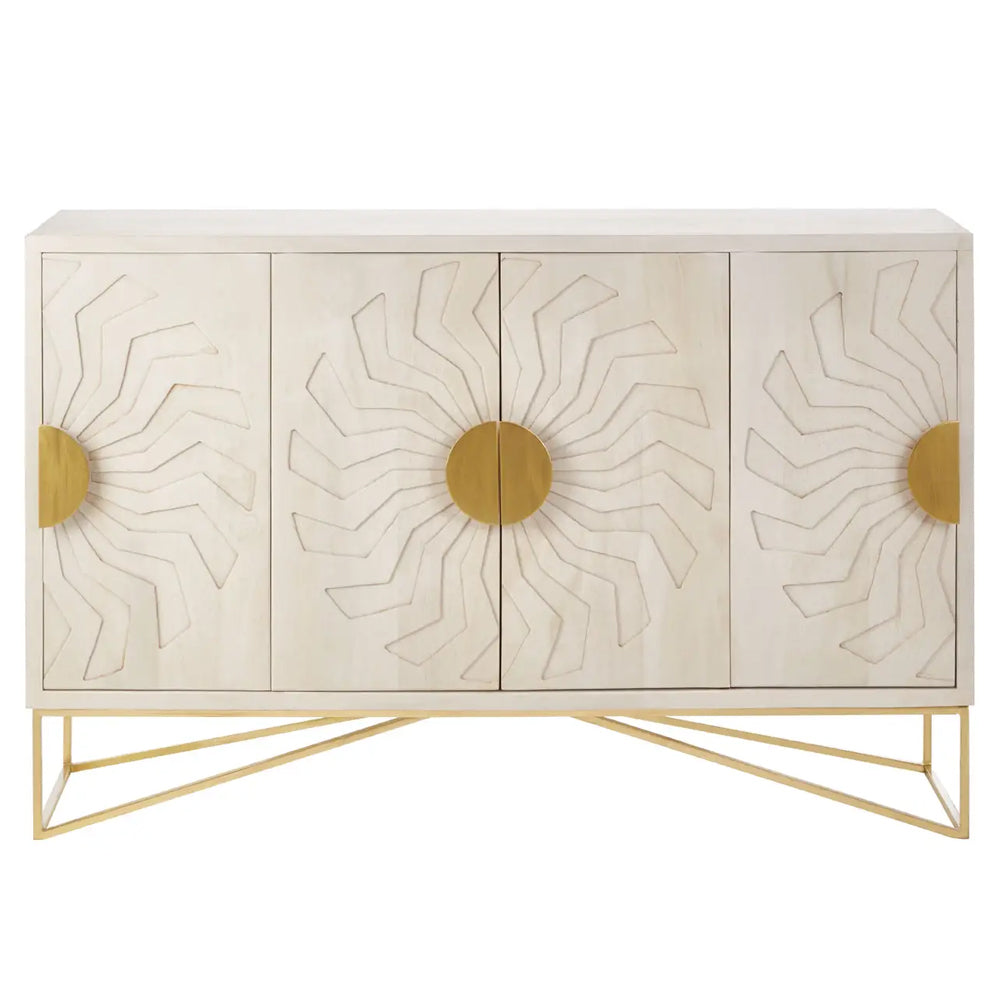 Handcrafted from sustainably sourced mango wood, this sideboard guarantees stability and longevity. It showcases a delicate, whitewashed finish adorned with tribal-inspired carvings, evoking images of the sun. Complementing this are the chic antique brass iron accents, serving both as ornate embellishments and functional handles. This piece features a roomy interior with shelved storage behind four doors, ensuring a clutter-free environment.