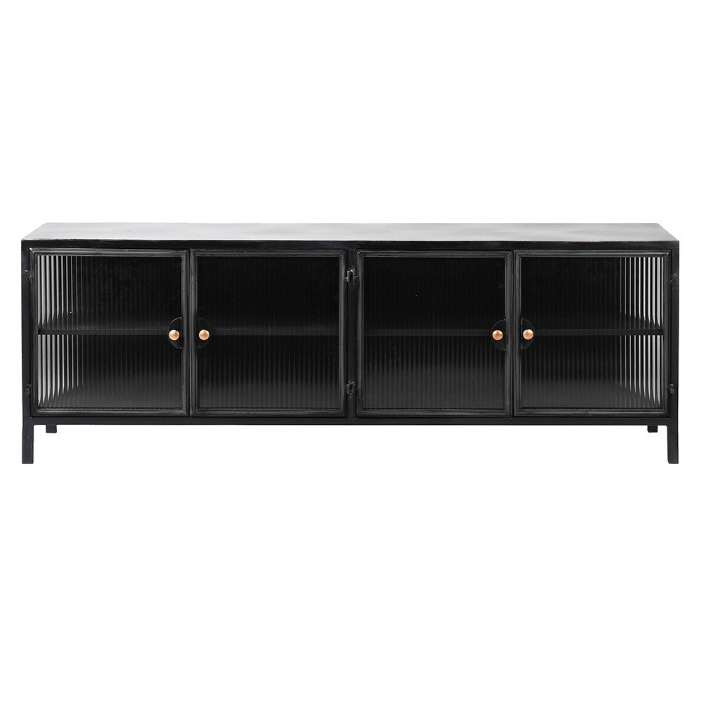 Standing on four, sleek legs, this chunky iron cabinet boasts a powerful presence. Four ribbed glass doors open to reveal convenient shelving to keep all your DVDs and video games organised and out of the way whilst its top is smooth and spacious – perfect for displaying your prized TV. Extending to the sides of the unit, its ribbed glass allows for an obscured view of its contents, and two golden handles complete the design with an opulent gleam.