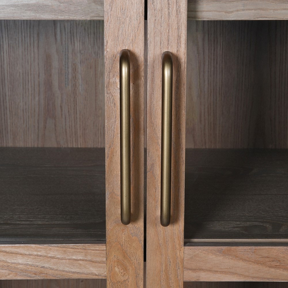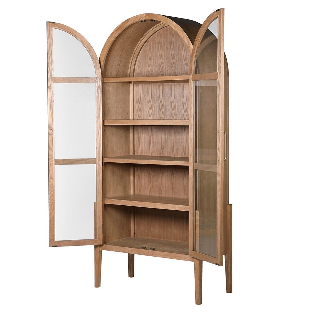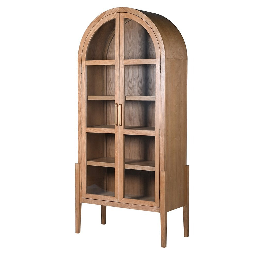 Made from warm elm wood and veneer, this cabinet features five spacious shelves behind framed glass doors, ideal for displaying books, decor, or treasured collectibles. The graceful arched top adds a classic architectural element, while the natural wood grain brings warmth and character to any room.