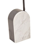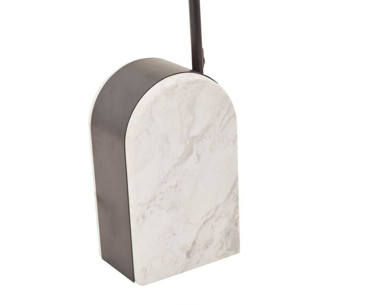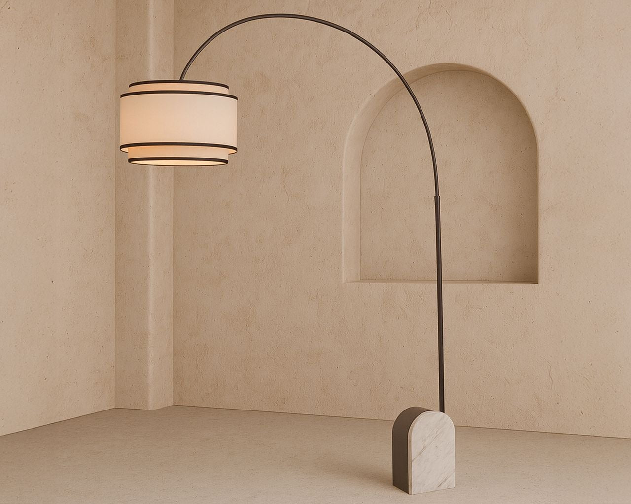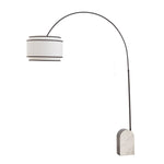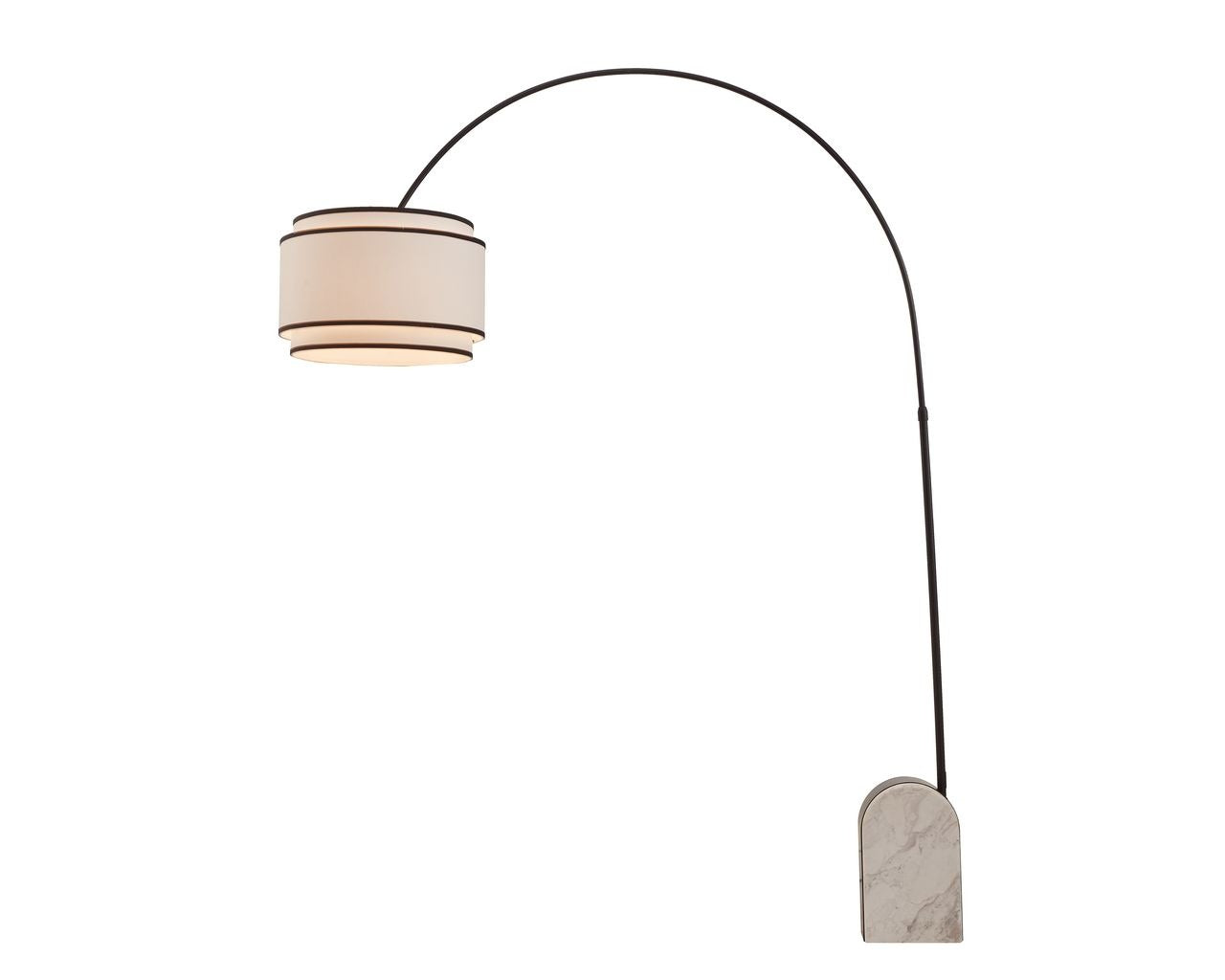 A heavy marble base anchors the sweeping arched metal stem, acting as a stylish counterbalance and creating a sculptural, architectural presence. The layered white linen shade, finished with a contrasting black trim, complements the metalwork and casts a warm, ambient glow throughout the space.