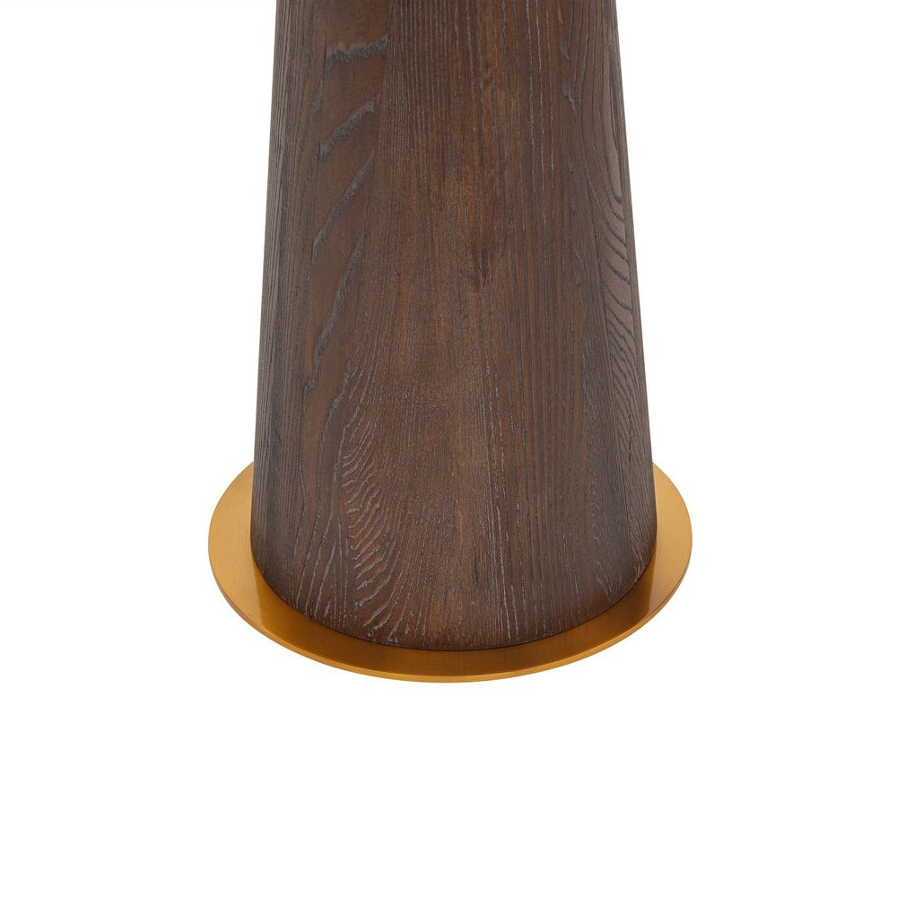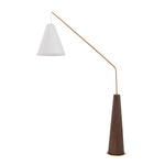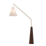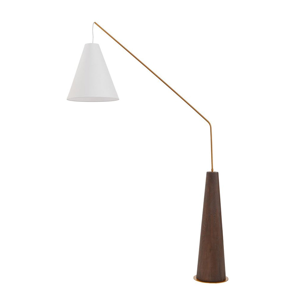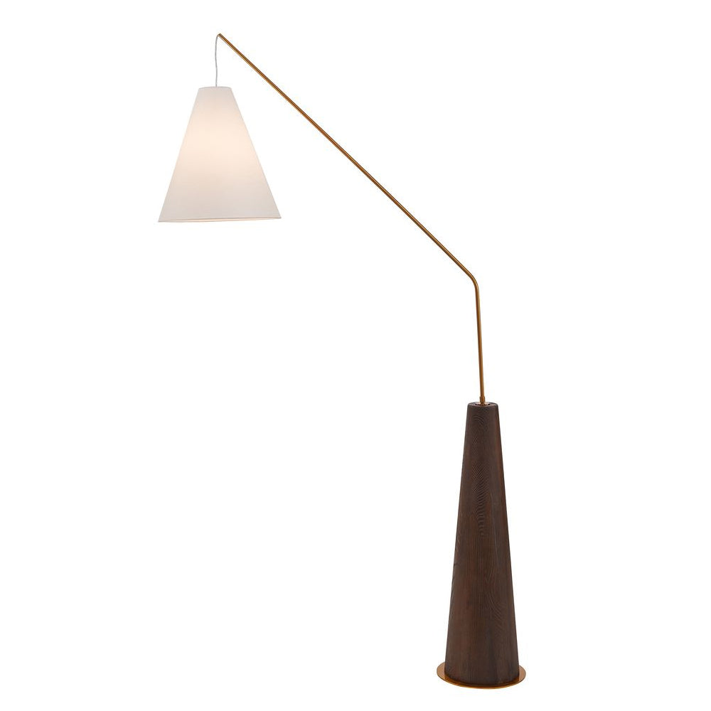 Boasting an elegant conical base made from brushed dark brown oak veneer with antique brass accents, it echoes subtle mid-century design elements. The base gives way to a slim, angled metal stem finished in matching antique brass for a cohesive look. A flared cream fabric shade completes the design with a soft contrast, directing light exactly where you need it.