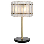 A harmonious blend of mid‑century and Art Deco design, it features a round base of black marble paired with a sleek stem finished in gleaming brass/bronze. The drum‑shaped shade is formed from textured glass panels that diffuse light to cast a warm, ambient glow, while exposed brass‑finished details accentuate the look with effortless refinement.