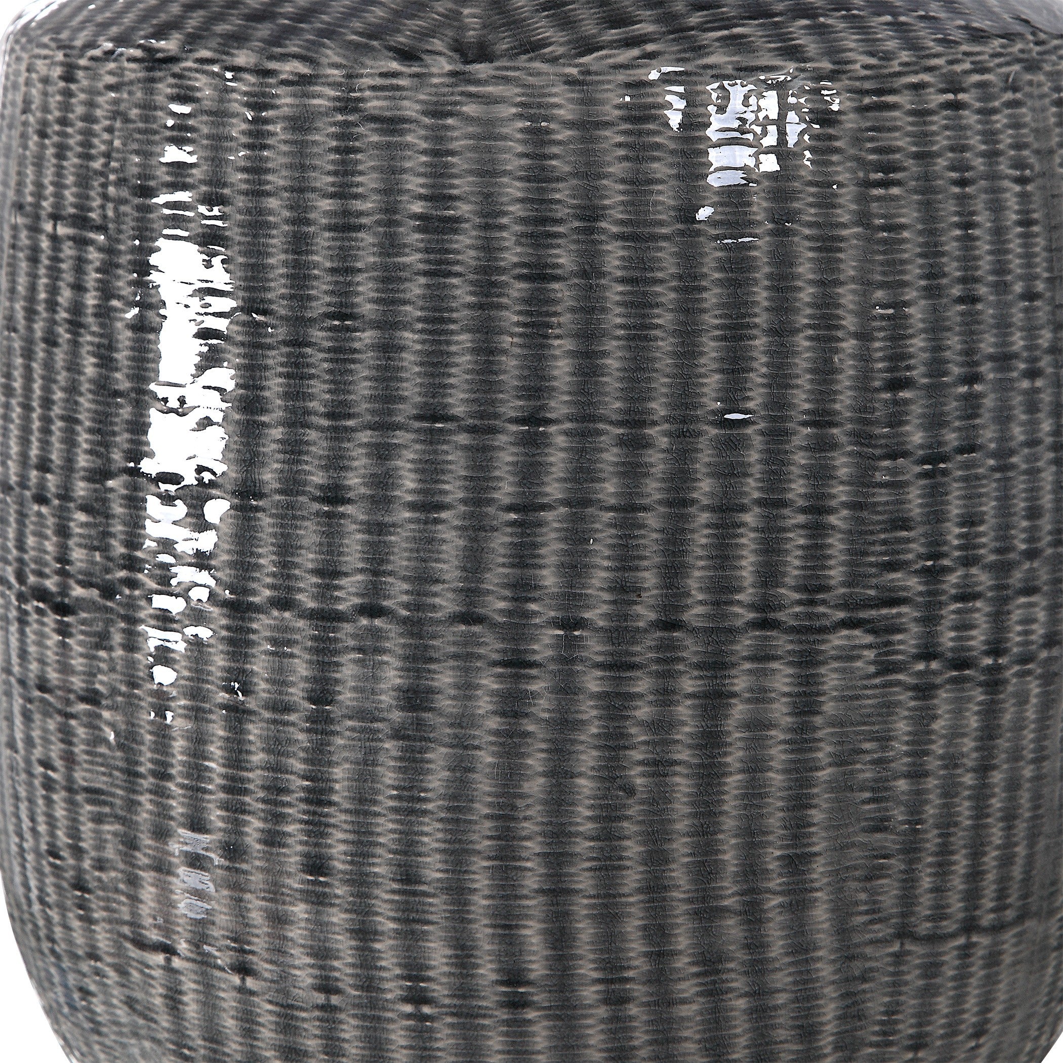 The striking ceramic base features a woven texture with a glossy blue‑grey distressed glaze, complemented by subtle nickel‑finished accents for added depth. A crisp white linen hardback shade sits atop, softly diffusing light throughout your space while maintaining a clean, contemporary aesthetic.