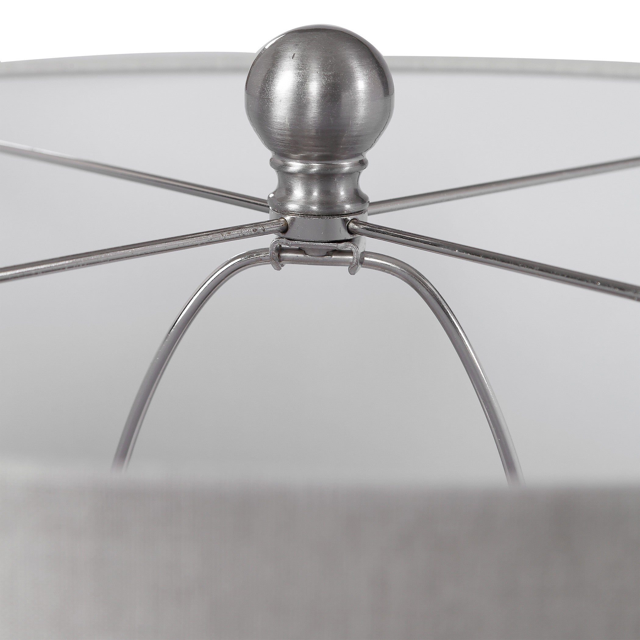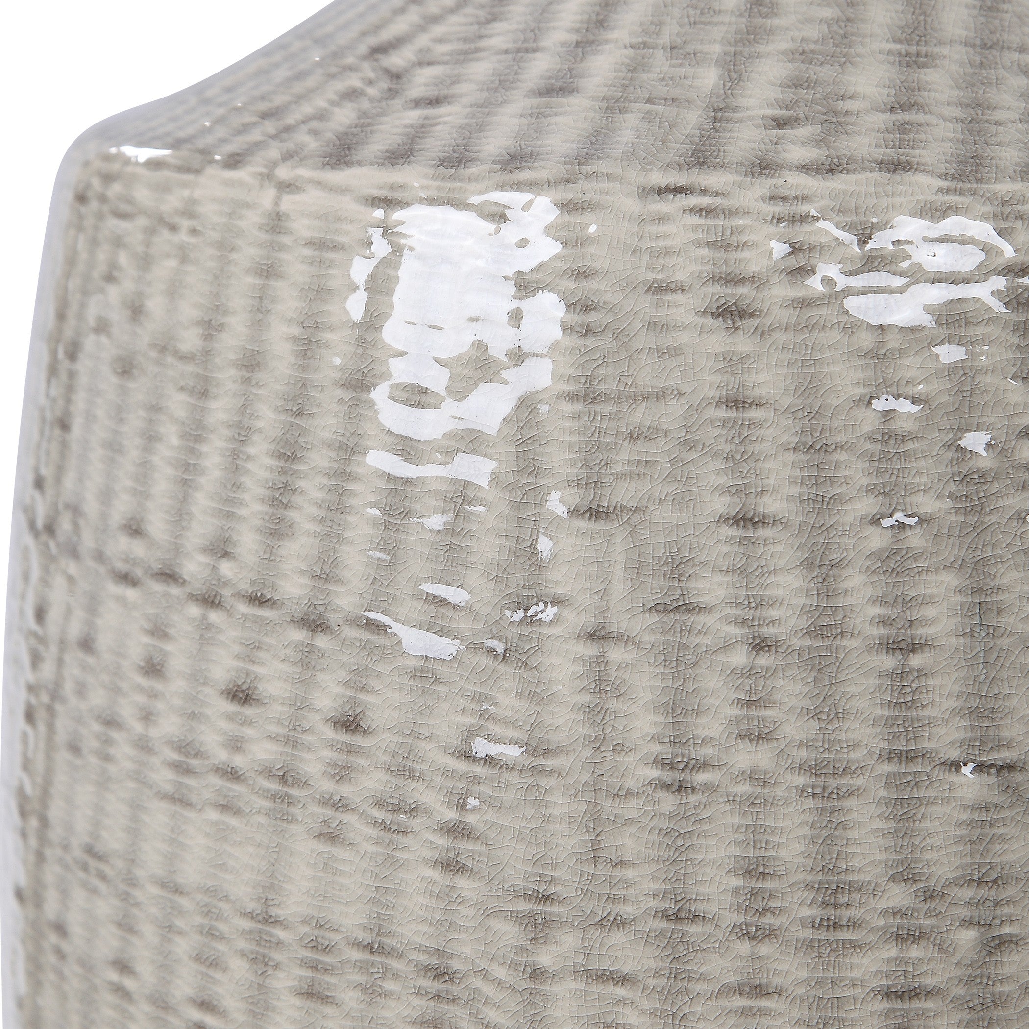 The striking ceramic base features a woven texture with a glossy grey glaze, complemented by subtle nickel‑finished accents for added depth. A light grey linen hardback shade sits atop, softly diffusing light throughout your space while maintaining a clean, contemporary aesthetic.