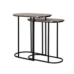 The Chandon End Tables are no ordinary choice for your home. They are stunningly sleek nestling together with ease to suit both large and small rooms. The tops are made from aluminium that has been given an aged quality for added grace. Oval in shape, their look is thoroughly alluring and unique. The streamlined bases are made from matte black coated iron which shows off their curves. Slide them together when you need more space or pull them apart to have two usable table spaces. Use them in any room that boasts contemporary interior décor or split across two areas to expand their reach.
