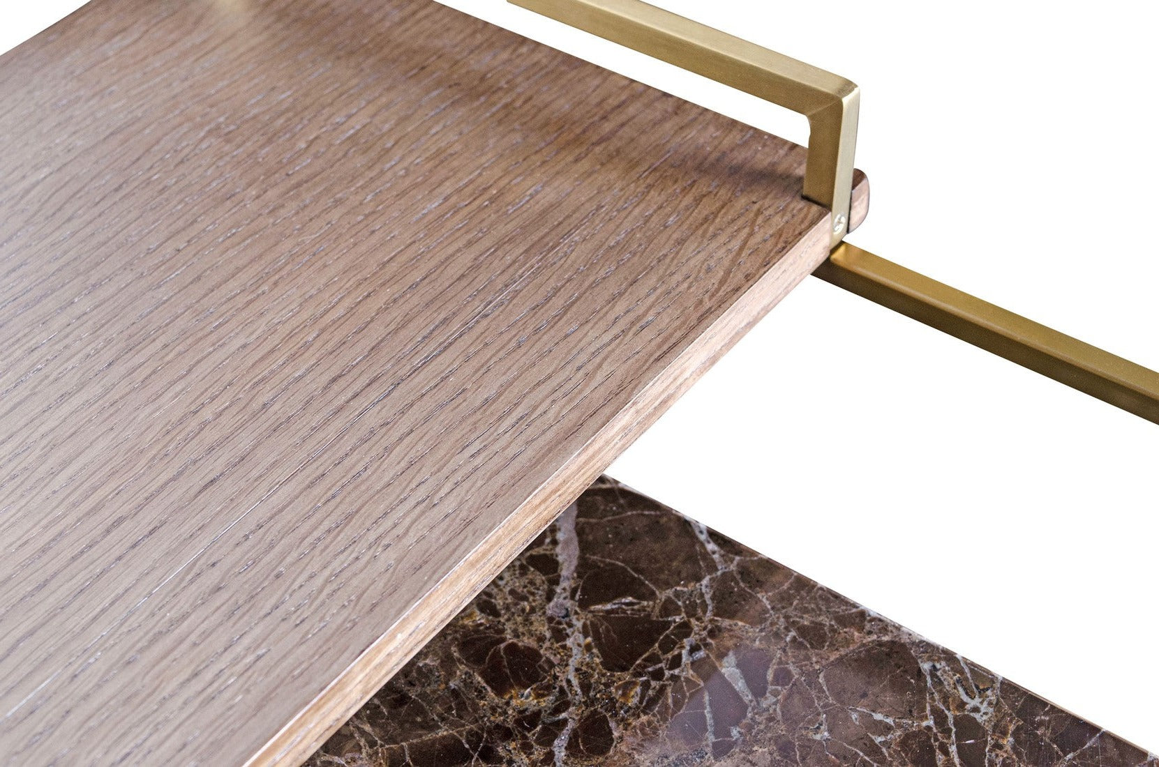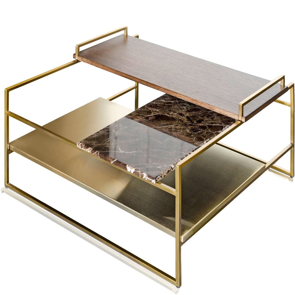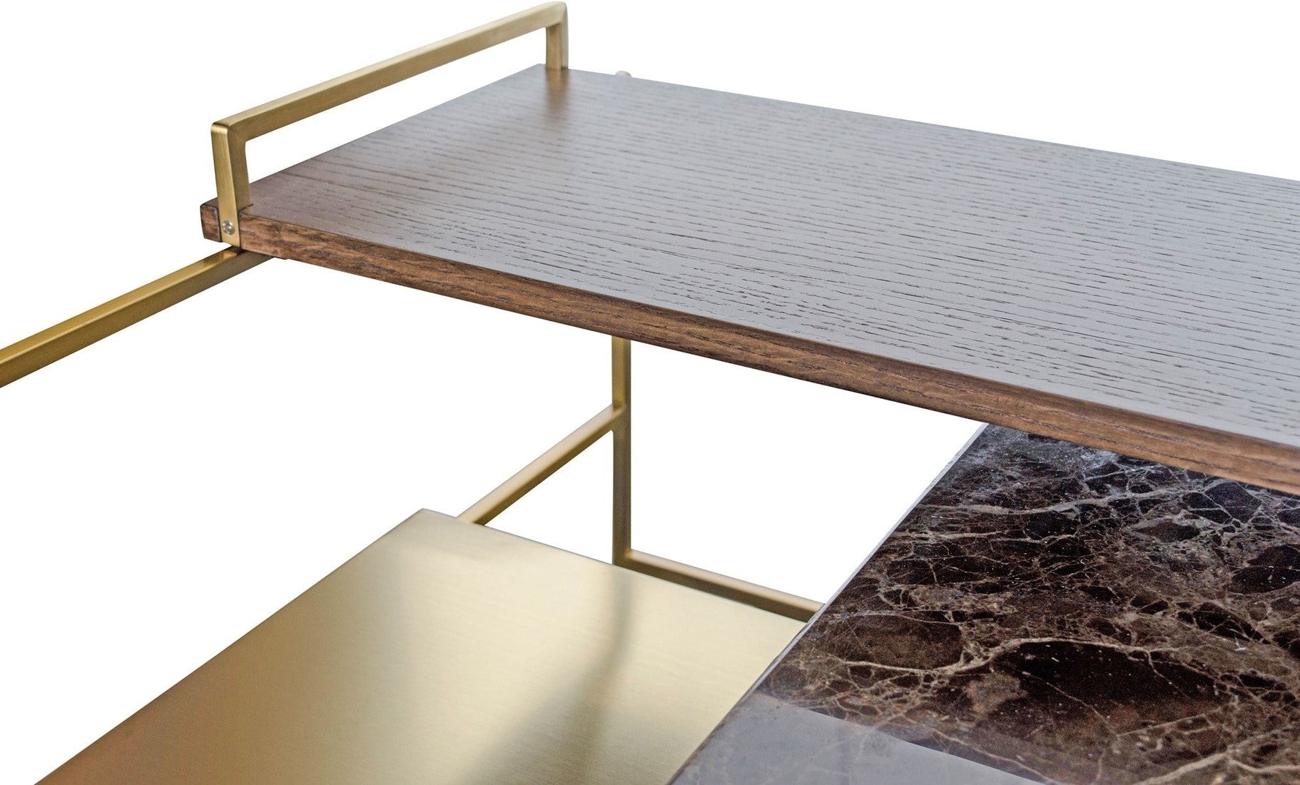 The architectural design of the Arris Coffee Table makes clever use of different levels, heights, and materials to ensure it stands out as the ultimate statement piece in your space. The bottom level and the frame itself are made from stainless steel which has been treated to an opulent brushed gold finish. The middle and top levels are a respective brown marble and oak veneer which come together for a radiant warmth. The result is spectacular – this table is as much of a work of art as a functional coffee table. Pride of place in your main seating area, the Arris Coffee Table will be the highlight of your space.