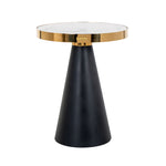 The Odin End Table is an easy glam to take your space by storm. The reverse tapered base is matt black stainless steel topped with a slick gold rim. Captured within this is fabulous faux white marble, presented with elegant grey flecks. This will give a luxurious touch to any room of the home. Its versatility ensures it will be welcome in any space. It could hold a vase of creamy peonies in the contemporary living area or a lamp in a modern hallway. Perhaps in the bedroom it will make a minimalist bedside table. It is practical and can meet your needs with a touch of charm.