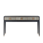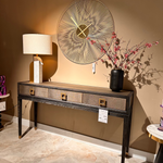 This final item in our collection from the Bloomville range of home furnishings offers a gently contrasted take on the console table. This three-door unit features panels of the ever-popular retro aesthetics of metal and leather, sitting within a modern yet strongly-made real oak table and drawers. Antique style gold hand-pulls and edgings complement the leather-panelled drawers which provide an extensive storage space. Colour matching with our other products in the Bloomville line is easy, and browsing our other offerings in the same marque is highly recommended!