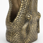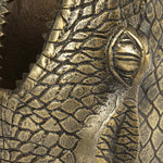 An untamed beauty, the See You Later Alligator Side Table unleashes a ferocious sense of art deco style in the heart of your space. Crafted from gold-painted recycled aluminium, this quirky side table is modelled after a fierce alligator, its powerful jaw wide open to support a rounded top. From the rows of sharp, jagged teeth to each individual scale, this piece is incredibly detailed, perfectly capturing the essence of this mighty apex predator as it guards your belongings. Bold yet elegant, the See You Later Alligator Side Table brings character wherever it goes.