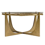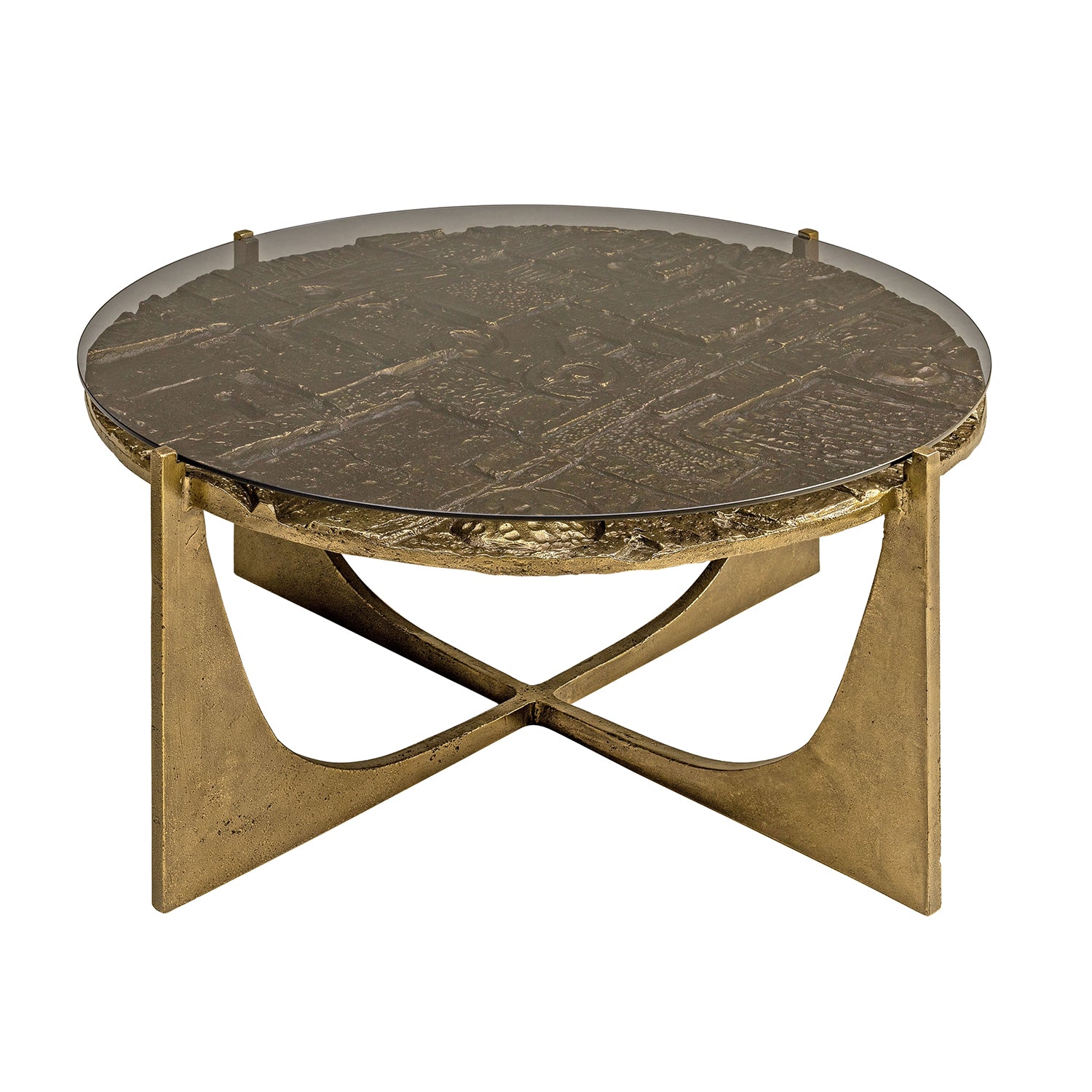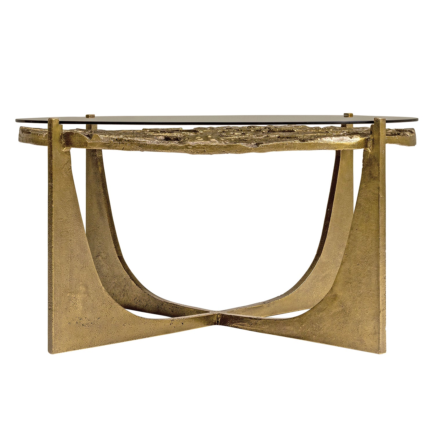 A futuristic vision with dazzling feature for the heart of your living area. The Lonsar Coffee Table is the stunning centrepiece to elevate any contemporary room. Aluminium with bronze colouring adds a luxurious quality to this impressive table. The design is a blend of historical opulence and futuristic style with symbols emblazoned into the top. This has a circular covering of clear glass over it. The stand is chunky with a raw and stylish edge. This impressive coffee table is striking and everything you want in your home. Give your room an element of beauty and make this table the true centrepiece of your space.