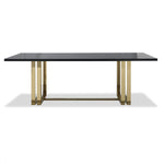 A highly modern and elegant piece, the beauty of the Lennox Dining Table lies in its simplicity and charm. The architecturally angular double legs are created from polished stainless steel with a brass finish. The top is formed from high quality, smooth black ash veneer which lends a very attractive finish. It has all the practicality of solid wood yet is easier to keep clean and looking good for longer. This is perfect for casual dining or for a formal dinner with friends, family or clients alike. It will comfortably fit 8 guests but with the generosity of the Lennox Dining Table, you can easily squeeze a couple of extras on when you need to.