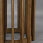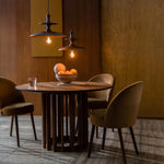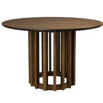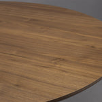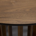 Crafted from durable rubberwood, its slatted base introduces lightness, visual rhythm, and architectural appeal. The rounded tabletop, made from walnut veneer, impresses with its clean profile and rich natural grain. Finished in a rich brown tone, it highlights the beauty of the wood, creating a warm, Scandinavian-inspired aesthetic that feels timeless and versatile.