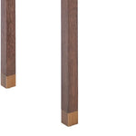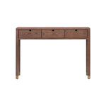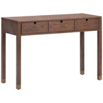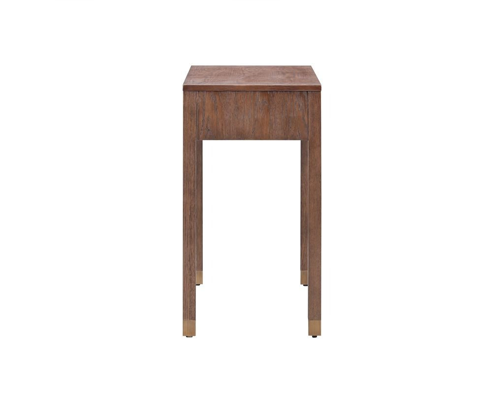 Supported by four sleek, brass-capped solid oak legs, the top is crafted from oak veneer in a warm brown finish that highlights the natural grain. It features three discreet drawers and a spacious surface to hold your makeup, lotions, and everyday essentials without clutter.