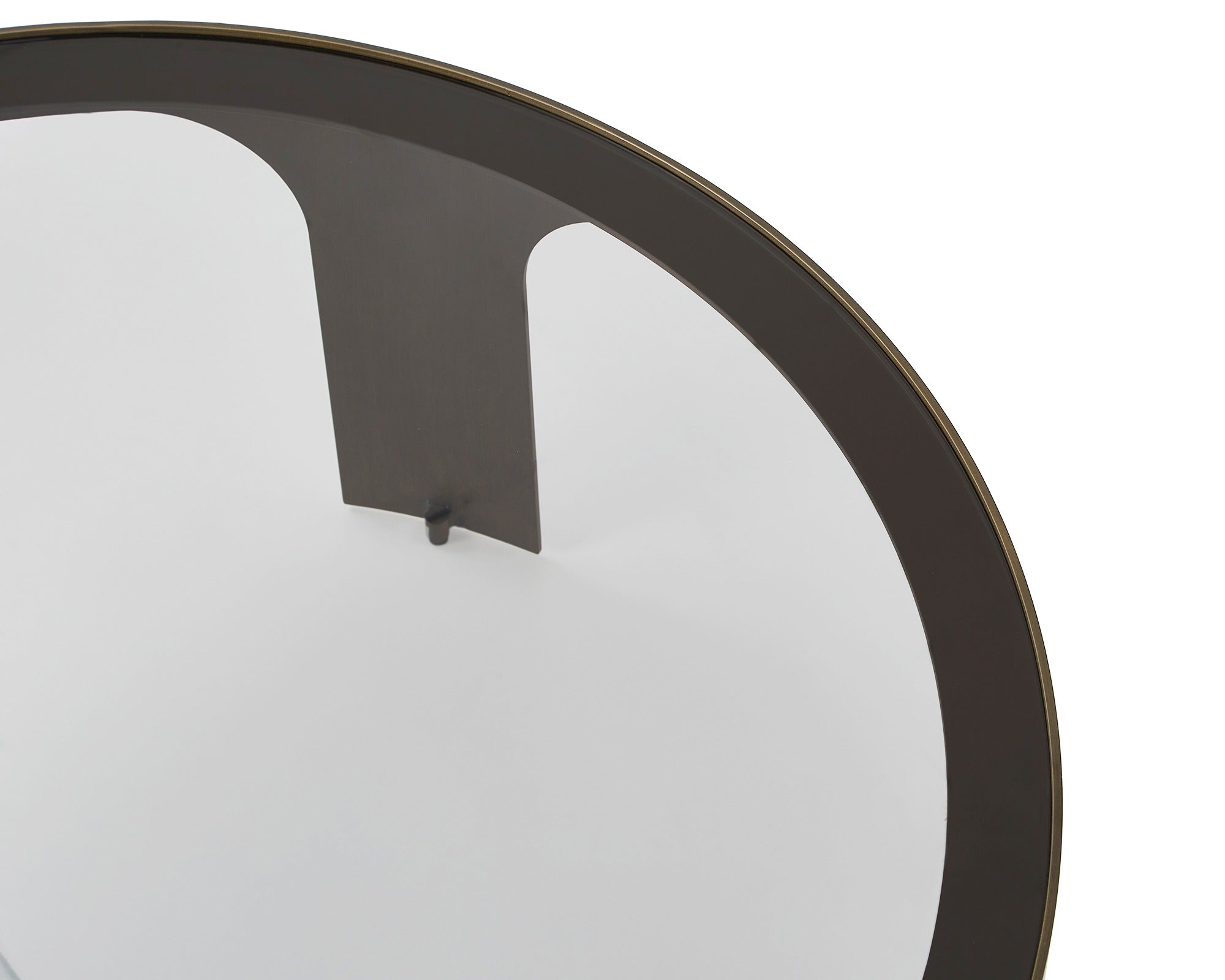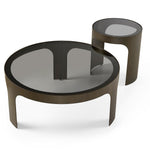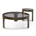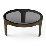 The table's metal frame, presented in a deep antique bronze, features a fluid rounded shape that extends gracefully into three sleek legs, adding a level of robustness to the overall design. This is beautifully complemented by an 8mm tempered smoked black glass tabletop, engineered to withstand the rigours of daily life without compromising on style.