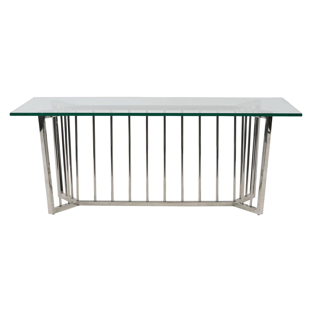 Fashioned from stainless steel, its angular frame and distinctive slatted base immediately draw the eye, providing not only support but also an element of architectural interest. This is perfectly complemented by the stunning rectangular top, crafted from clear glass, which adds an air of sophistication and seamless elegance.