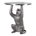 Made from strong metal with a textured silver-tone finish, the base is an eager-to-please monkey. It sits low, almost looking as though it’s ready to stand up and serve drinks. Its arms reach above its head and its eyes focus upwards, watching the table top balance on its upturned palms - quite a sight when it’s filled with drinks!