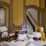 Made from resin but imbued with the refined appearance of travertine marble, this table effortlessly blends modern craftsmanship with traditional aesthetics. Its elegant organically-shaped top is complemented by an equally intriguing, obscure body, adding layers of visual interest to the piece. Not just a conversation starter, it also serves as a functional table perfect for social gatherings.