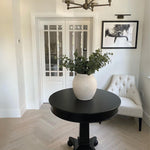 Our stunning black lacquered small round table makes a stunning addition to a hallway! Imagine it topped with an oversized vase and accessories to welcome guests into the home. Its small diameter and chunky poplar wood top make it perfect for this purpose. It can also be used as a bistro or bar table for intimate nibbles for two.