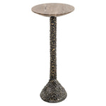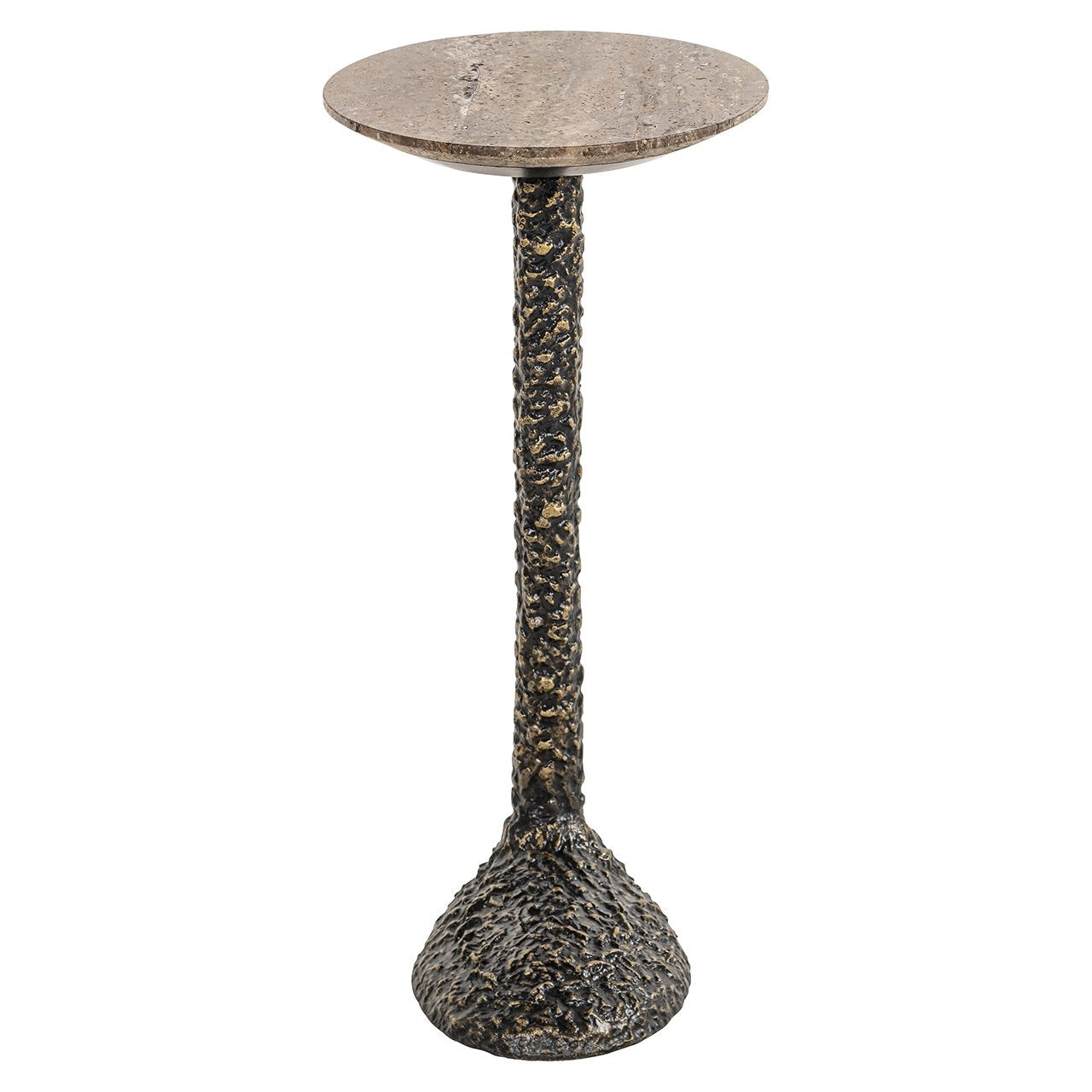 Its textured aluminium base features an organic, molten-like finish that adds artisanal depth and visual intrigue. Topped with smooth natural travertine, the contrast in materials creates a refined balance of elegance and durability. Subtle veining in the stone enhances its natural beauty, making each piece unique.