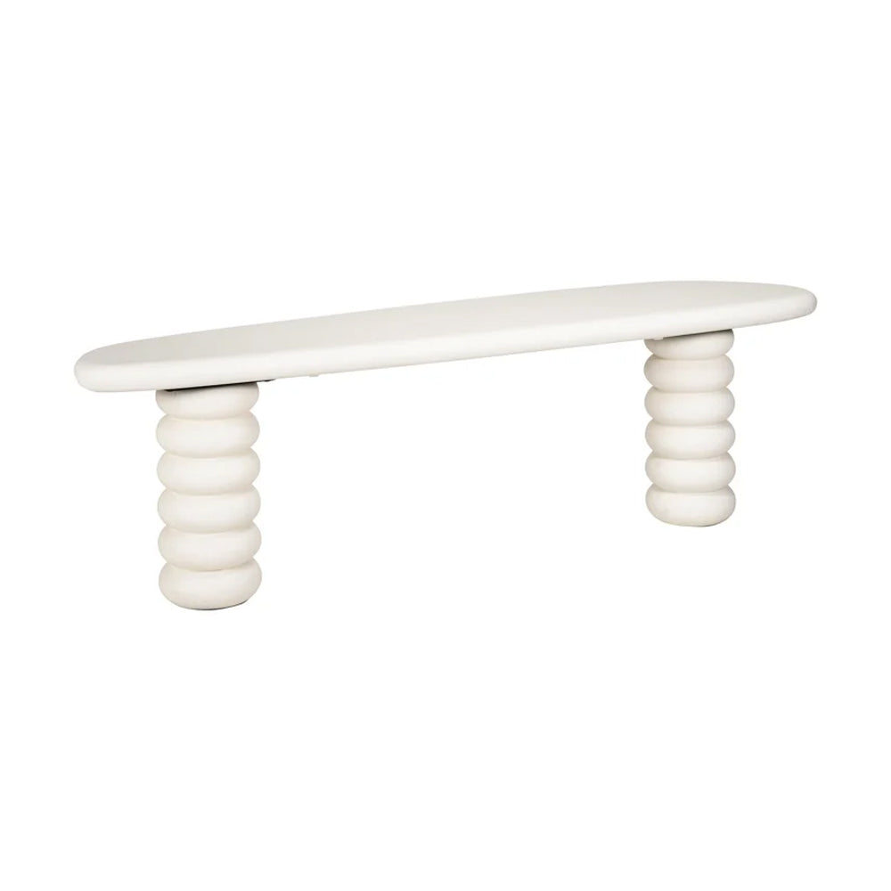 Crafted from wood with a light eco plaster finish, this TV unit showcases a whimsically shaped top supported by two playful, twisted legs. Its minimalistic design, offset with a touch of fun, lends character to your space while serving as the ideal platform for your TV. Any remaining space can be utilised for displaying photo frames, ornaments, or floral arrangements, making it a versatile addition to any living room or hallway.