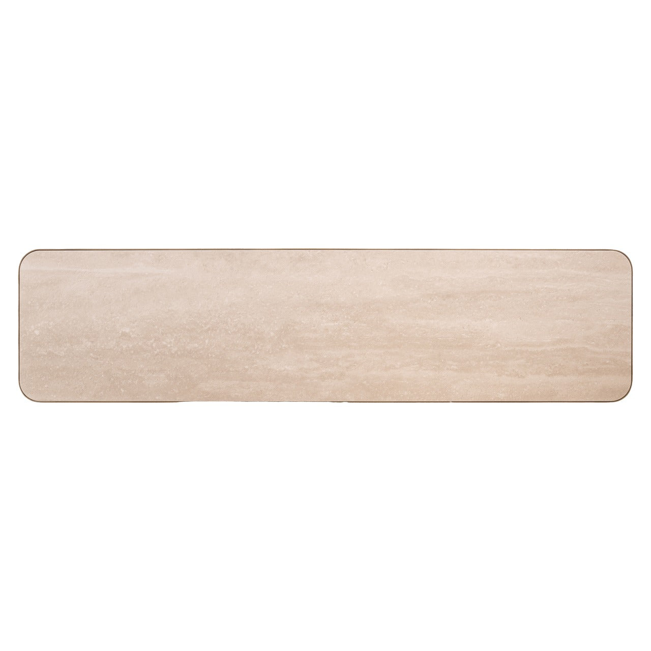 Defined by clean lines and a gracefully curved silhouette, this elegant piece is crafted from iron with a warm gold finish, adding a touch of modern opulence to any interior. The sandy ceramic top, designed to emulate natural travertine, introduces subtle texture and refined contrast against the sleek metal frame. A matching lower shelf provides additional space for displaying books, décor, or floral arrangements.