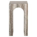 Crafted from faux travertine, it features a smooth stone-effect finish and a distinctive arched base that bring architectural beauty and balance to any interior. Compact yet impactful, it sits perfectly beside a sofa or lounge chair, providing a stylish surface for a drink, lamp, or decorative accents.