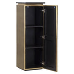 Its striking brass ribbed exterior encases a solitary door, which opens up to reveal a shelved haven, perfect for an orderly space. Crowned with a square black marble top, it invites you to display your most treasured ornaments. Poised to enhance your living room with a touch of grandeur, or to offer a welcoming sophistication in your hallway, this piece is versatility personified.