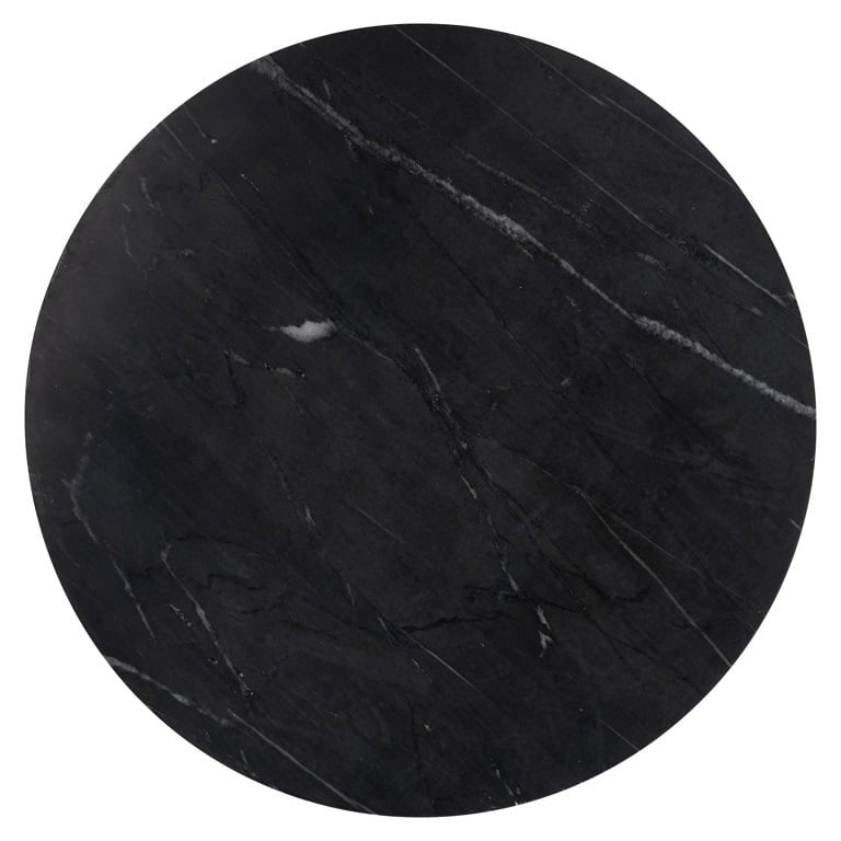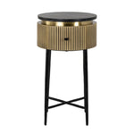 Standing on four slender metal legs with a crossover frame, this table exudes stability and style. Its rounded wooden tabletop, accentuated with brass finishes and linear grooves, is crowned by opulent black marble. Complete with a discreet drawer, it's the epitome of chic functionality.