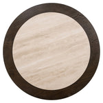 Showcasing a considered mix of materials, it captivates with the striking contrast of light and dark finishes. The circular base, crafted from oak veneer and recycled wood, radiates natural warmth, with the rich dark brown finish accentuating the wood grain. Above, the rounded top is divided between a coordinating wooden trim and a travertine-effect ceramic centre, creating depth and visual intrigue.