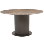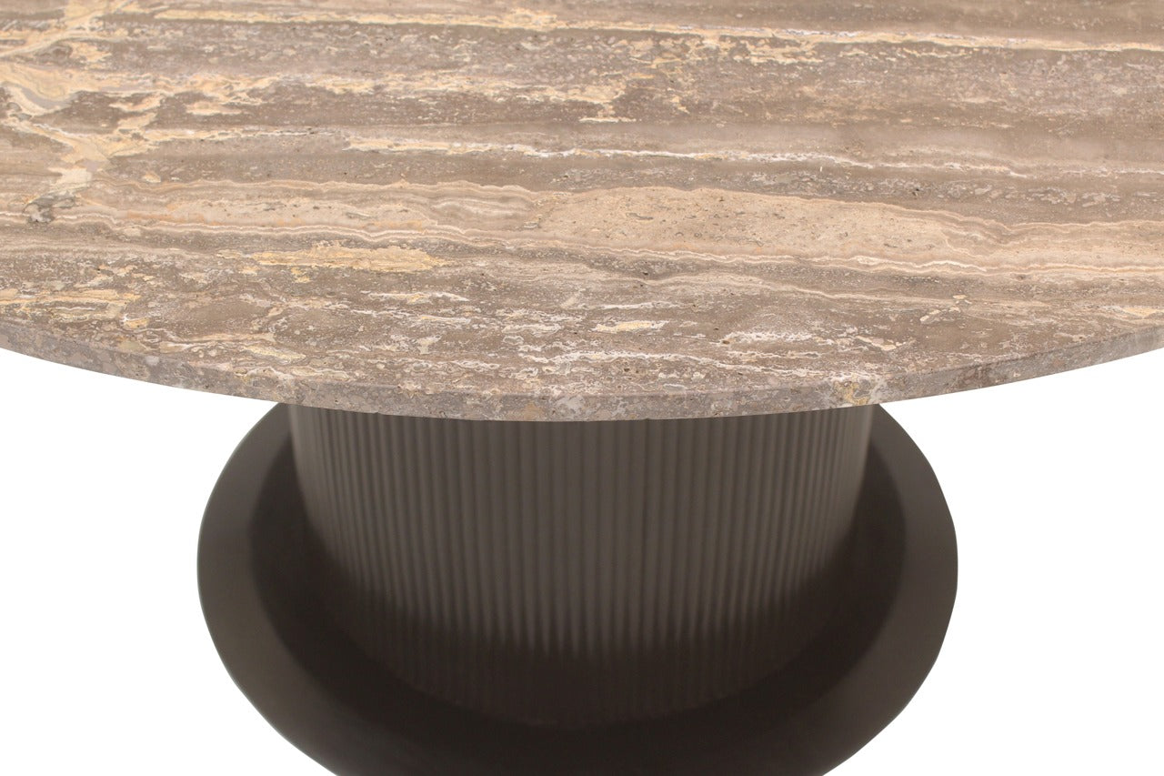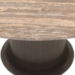 The fluted pedestal base has a bold architectural quality that stands out in any setting, instantly anchoring your space with presence and style. The round top is crafted from rich brown travertine, grounding the piece with a tactile, earthy aesthetic that pairs beautifully with a wide range of interiors.