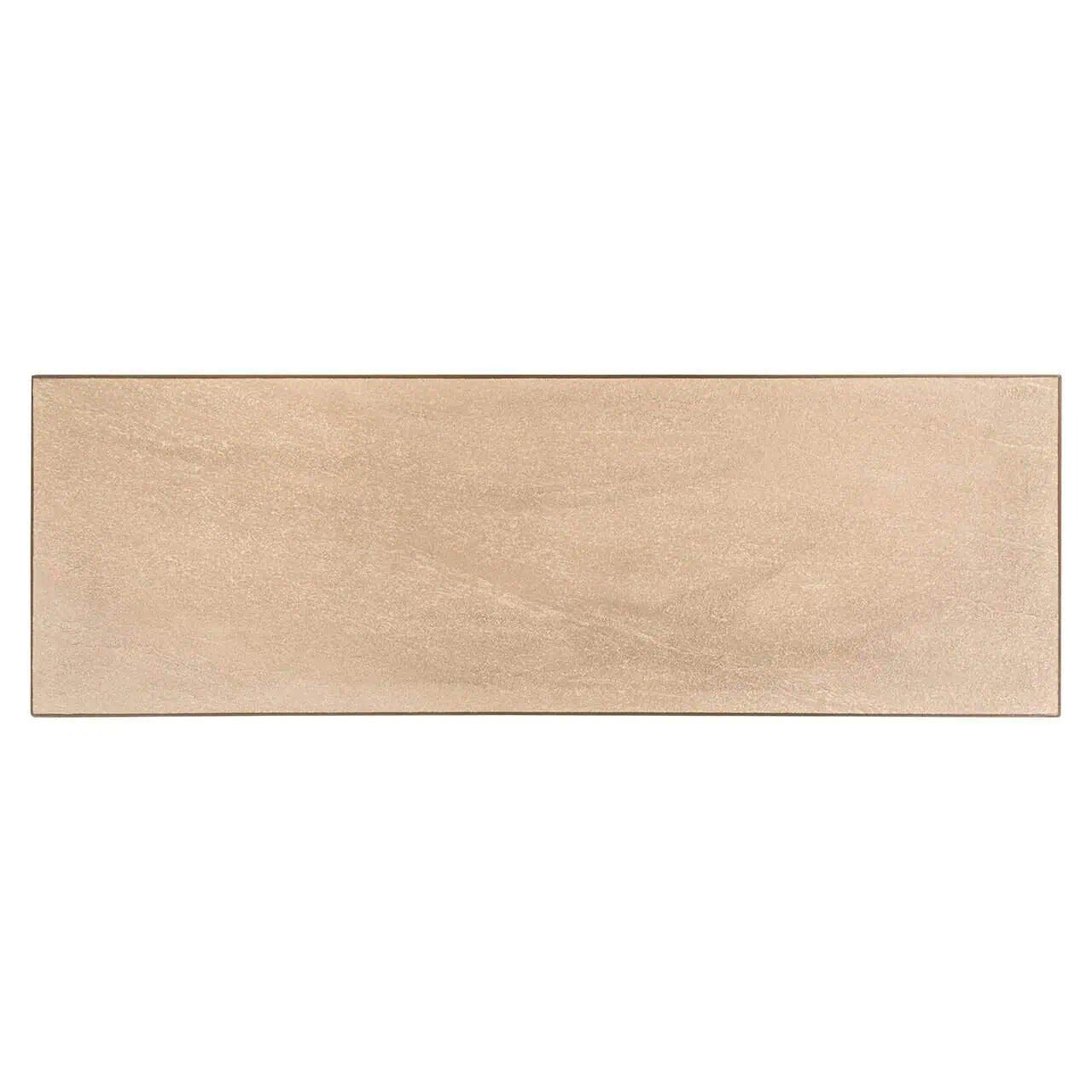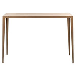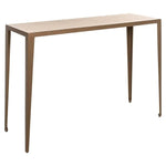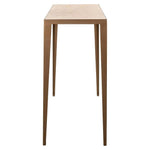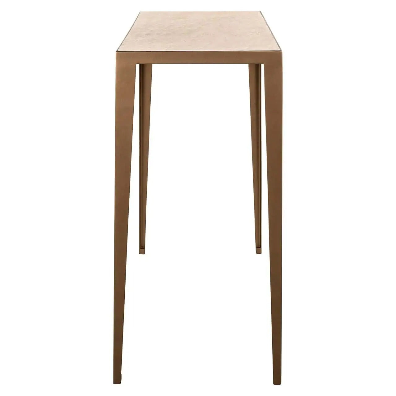 Slim tapered legs and a streamlined profile reflect Scandinavian and contemporary industrial influences, while the warm metallic finish adds a touch of opulence. The long porcelain top mimics natural stone, offering a stylish platform for décor and everyday essentials.