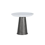 Its bold, conical base is clad in hand-hammered metal with a burnished silver finish, offering rich depth and artisanal detail. Topped with a smooth disc of white marble, the piece balances rugged form with refined elegance. The interplay between materials gives it a sculptural presence, perfect for adding a hint of luxury beside a sofa or accent chair.