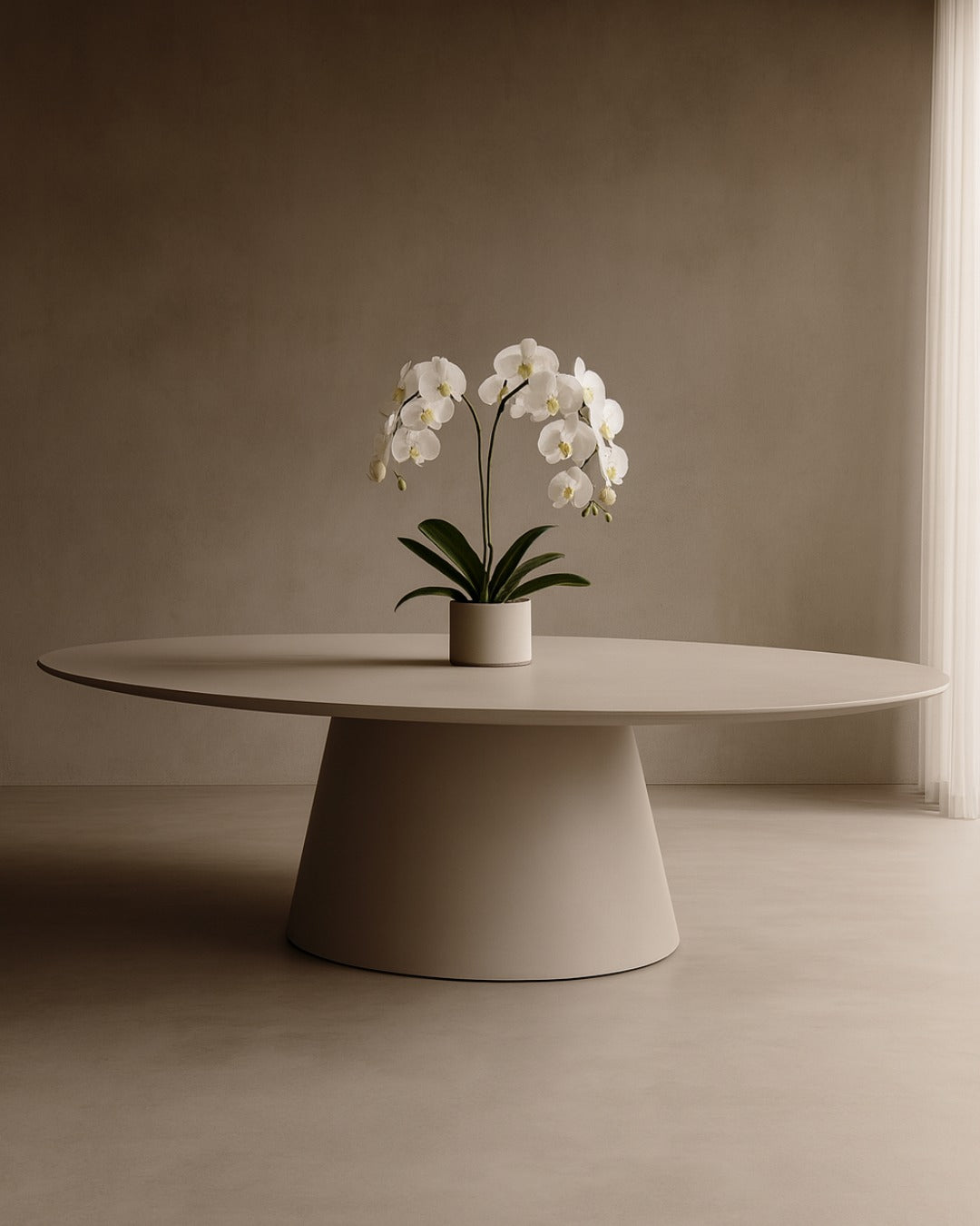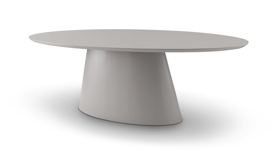 Crafted with a matte beige lacquer finish, this table effortlessly blends form and function to become the focal point of any dining space. Its conical base not only adds a touch of contemporary flair but also ensures unparalleled stability whilst the oval table top provides an inviting setting for shared meals and lively conversations.