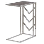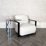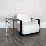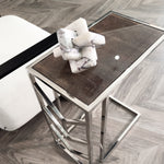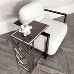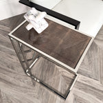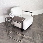 A piece full of promise and careful attention to detail, the Umalis Side Table is all set to impress. Decked out in shining silver metal, its bright appearance adds a fabulous style to your space. The L shaped frame is sturdy and substantial to ensure it will stand up to your requirements. In addition, the central section of the frame has chevron detailing which gives an attractive extra detail. The framed top section is upholstered with an extremely exclusive material. That is faux shagreen, covered in glass, which has a textured charcoal look that is elegant. A fabulous piece to join with your favourite chair for style and poise.