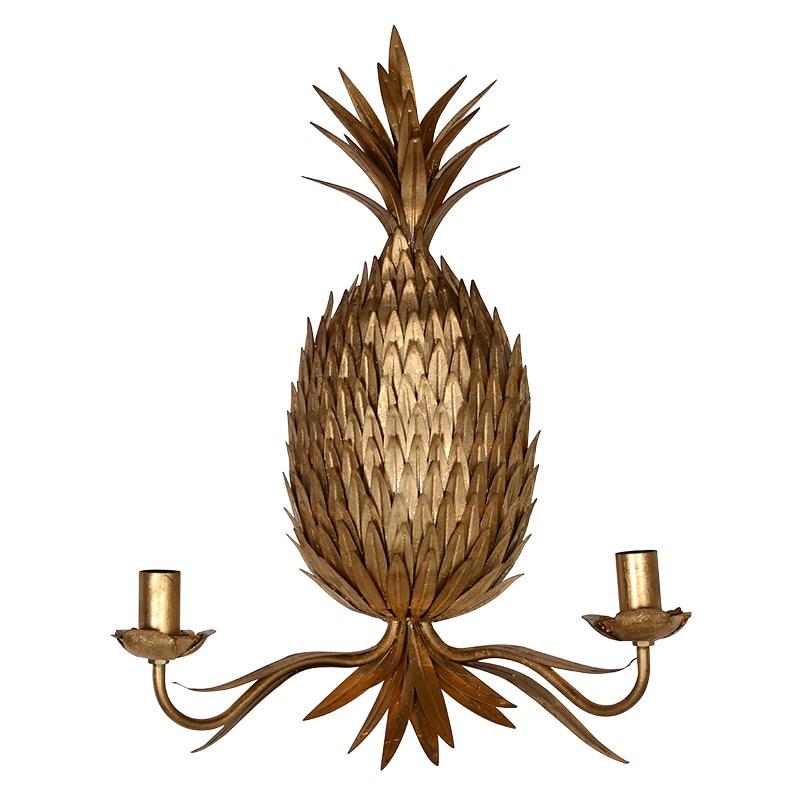 The pineapple was a European symbol of extreme wealth and taste, for much of recent history. The Jugo Wall Sconce brings all that opulence and awe direct to your space. A fabulous vision in burnished gold, with a high-level attention to detail. Flowing from the decorative centre are two arms suitable for candle bulbs. Their light reflects the pineapple decoration, to fully enclose a room. Perfect in pairs, they will make a glamorous addition to any space. Elevate your room to levels you can only imagine. It will impress as much today as the real thing did a hundred years ago!