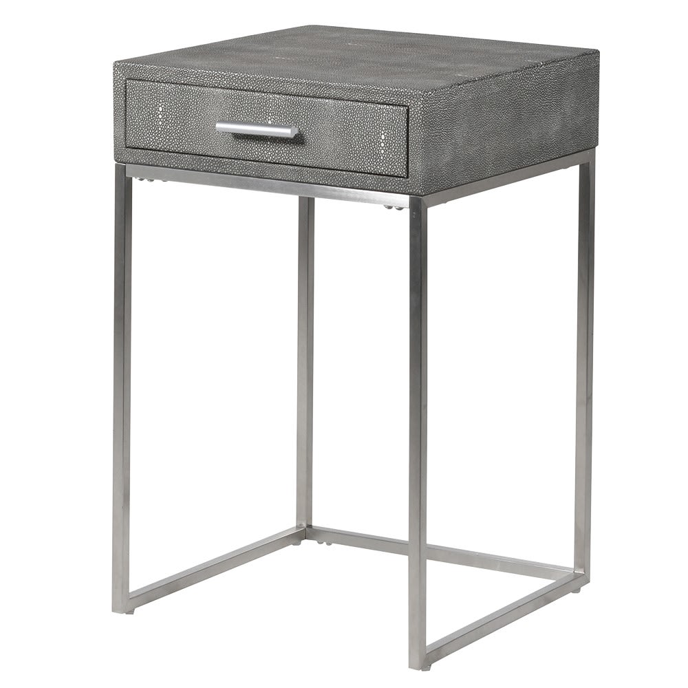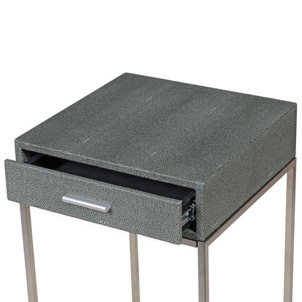 A glamorous elegance exudes from the valued-priced Kisane Side Table. With a charming appeal it will be the pride of any space. The table top area is formed from a faux shagreen leather effect. The single drawer makes a pleasing accompaniment to the overall look and use. The table legs and handle are a classic silver with long straight lines. Not only are they a wonderful complement to the upper area but they are strong and sturdy despite their dainty appearance. As a complete piece it truly shines and offers a touch of class and period refinement.
