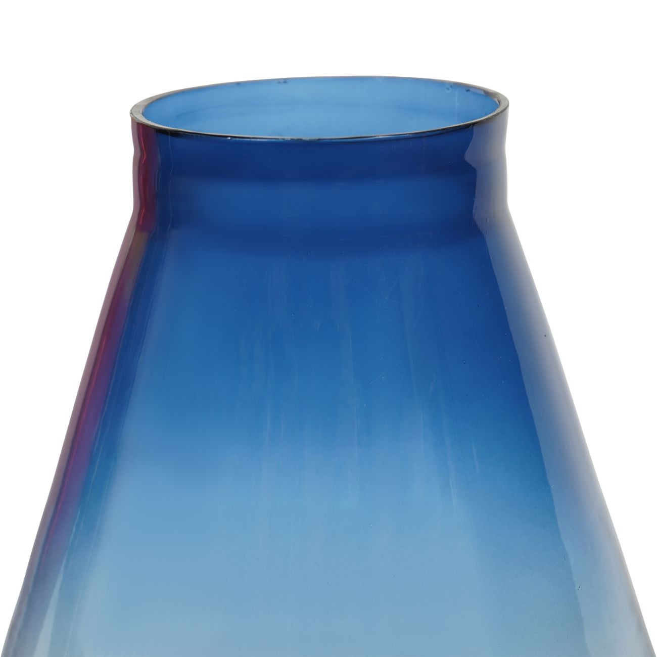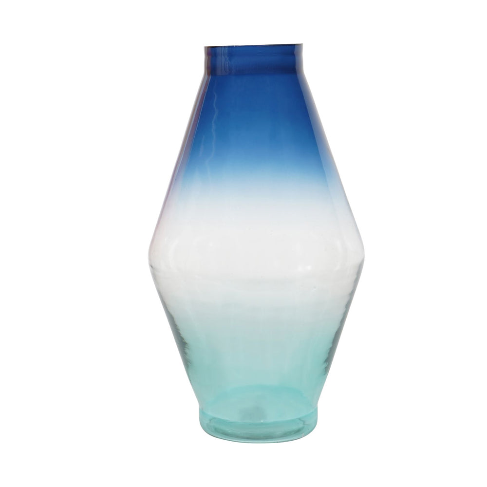 Showcasing a captivating ombre effect, this diamond-shaped glass vase masterfully transitions from a light blue at the bottom, to clear glass, before culminating in a deep blue at the top. Crafted using traditional glassblowing techniques, it is a testament to skilled craftsmanship with small variations ensuring that each vase is unique.