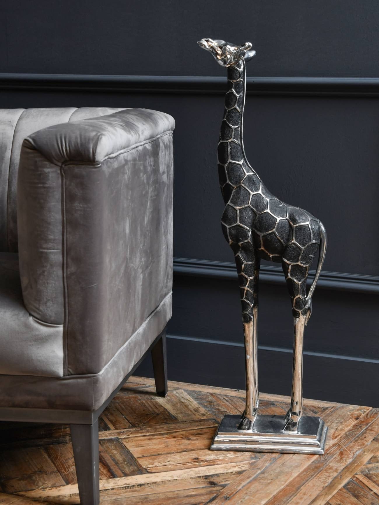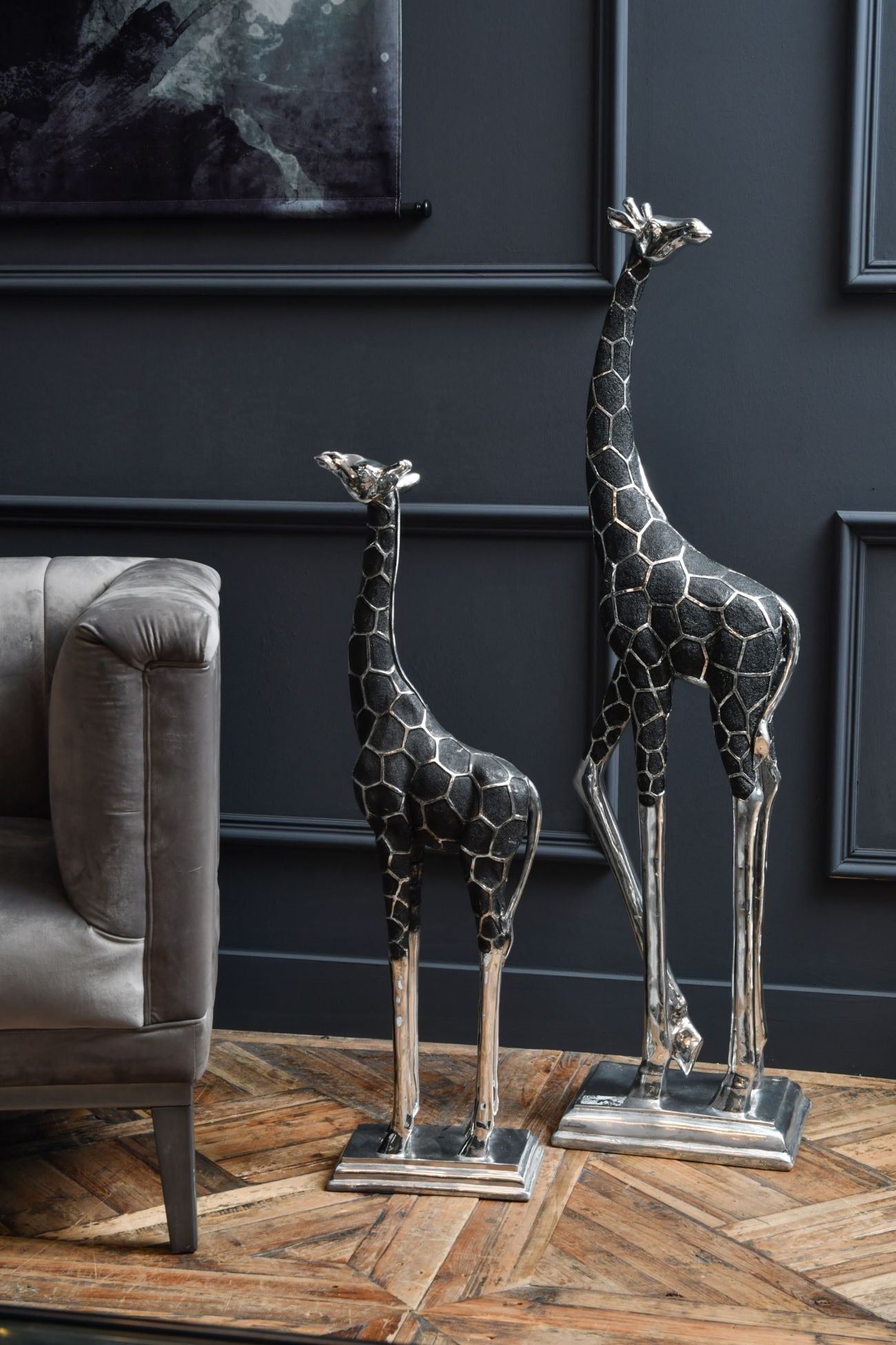 Standing at an impressive 92 centimetres, this charming piece is crafted from high-quality resin with a striking silver, electroplated finish. Its large size and distinctive design ensure it stands out in any setting, beautifully capturing the majestic nature of giraffes.