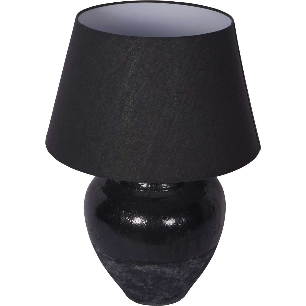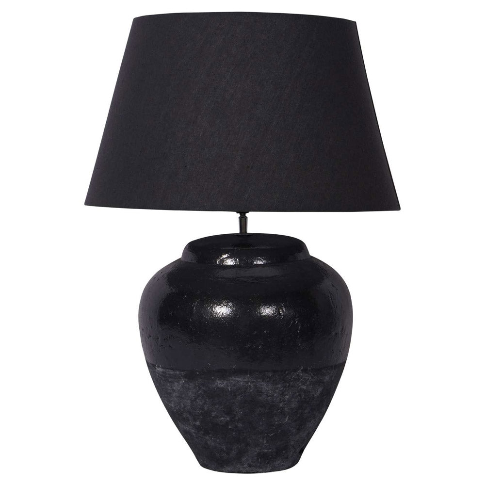 Its urn-shaped porcelain base showcases a striking split design, featuring a black rustic ceramic glaze that contrasts a smooth, glossy upper half with a rough, textured lower half. This subtle interplay of finishes creates visual interest while maintaining a serene, neutral aesthetic. The lamp is crowned with a classy tapered fabric shade, softly diffusing light to create a warm and inviting ambiance.