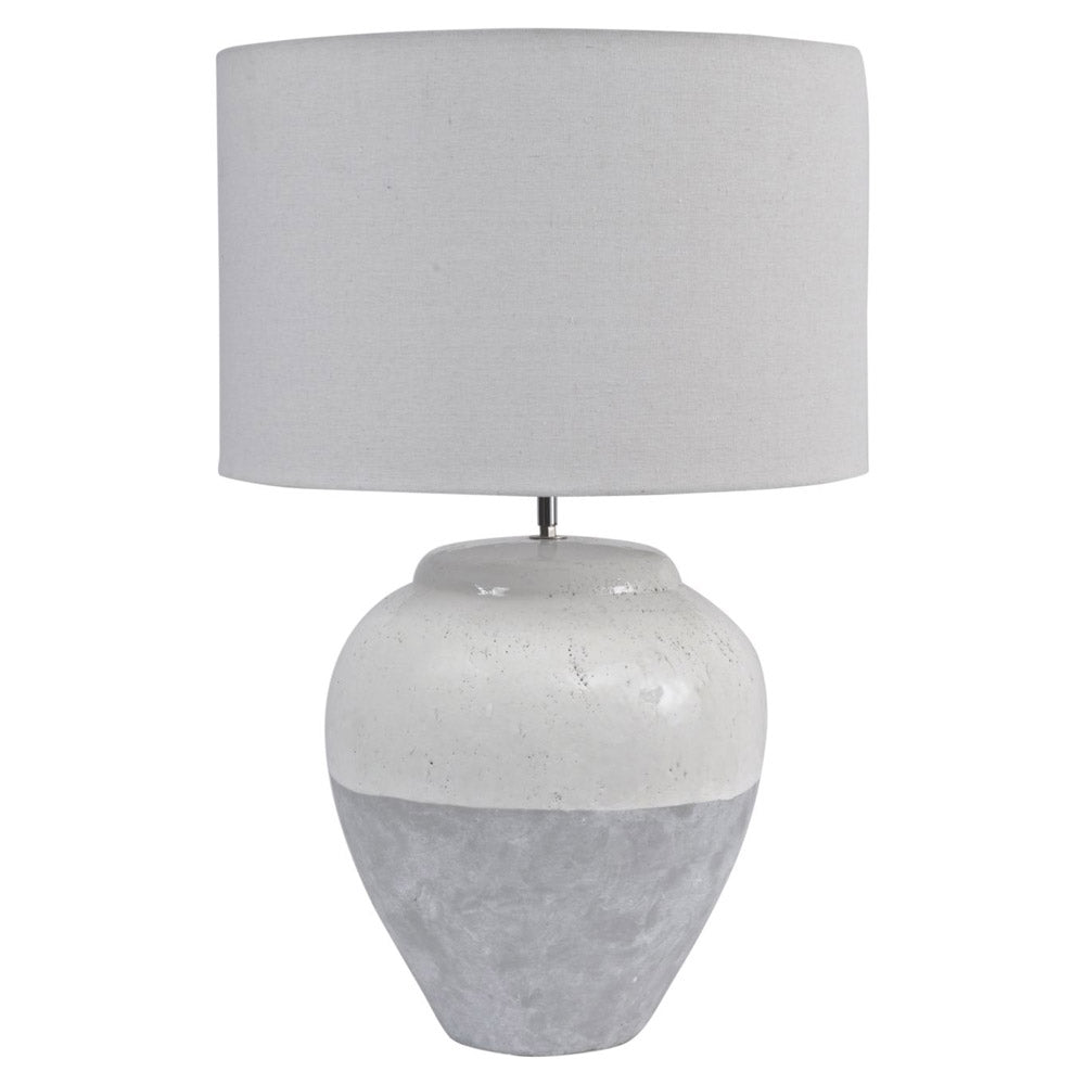 Its urn-shaped porcelain base showcases a striking split design, featuring a grey rustic ceramic glaze that contrasts a smooth, light glossy upper half with a dark, textured lower half. This subtle interplay of finishes creates visual interest while maintaining a serene, neutral aesthetic. The lamp is crowned with a classy drum-shaped fabric shade, softly diffusing light to create a warm and inviting ambiance.
