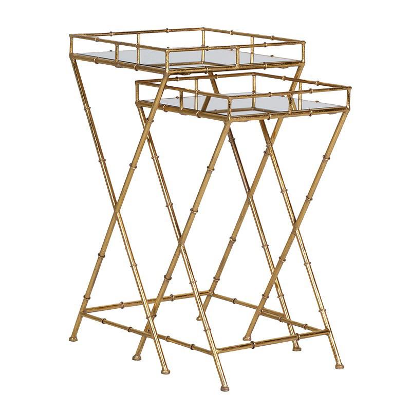 Flaunting a glitzy finish and bamboo style frame, the tables combine a nature-inspired design with a dollop of glamour. Mirrored glass tops add a reflective dimension to the set, resulting in a polished and glossy aesthetic.