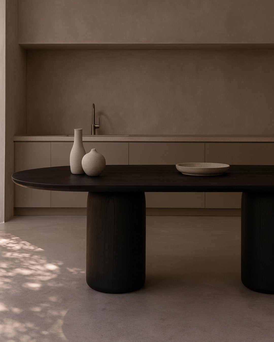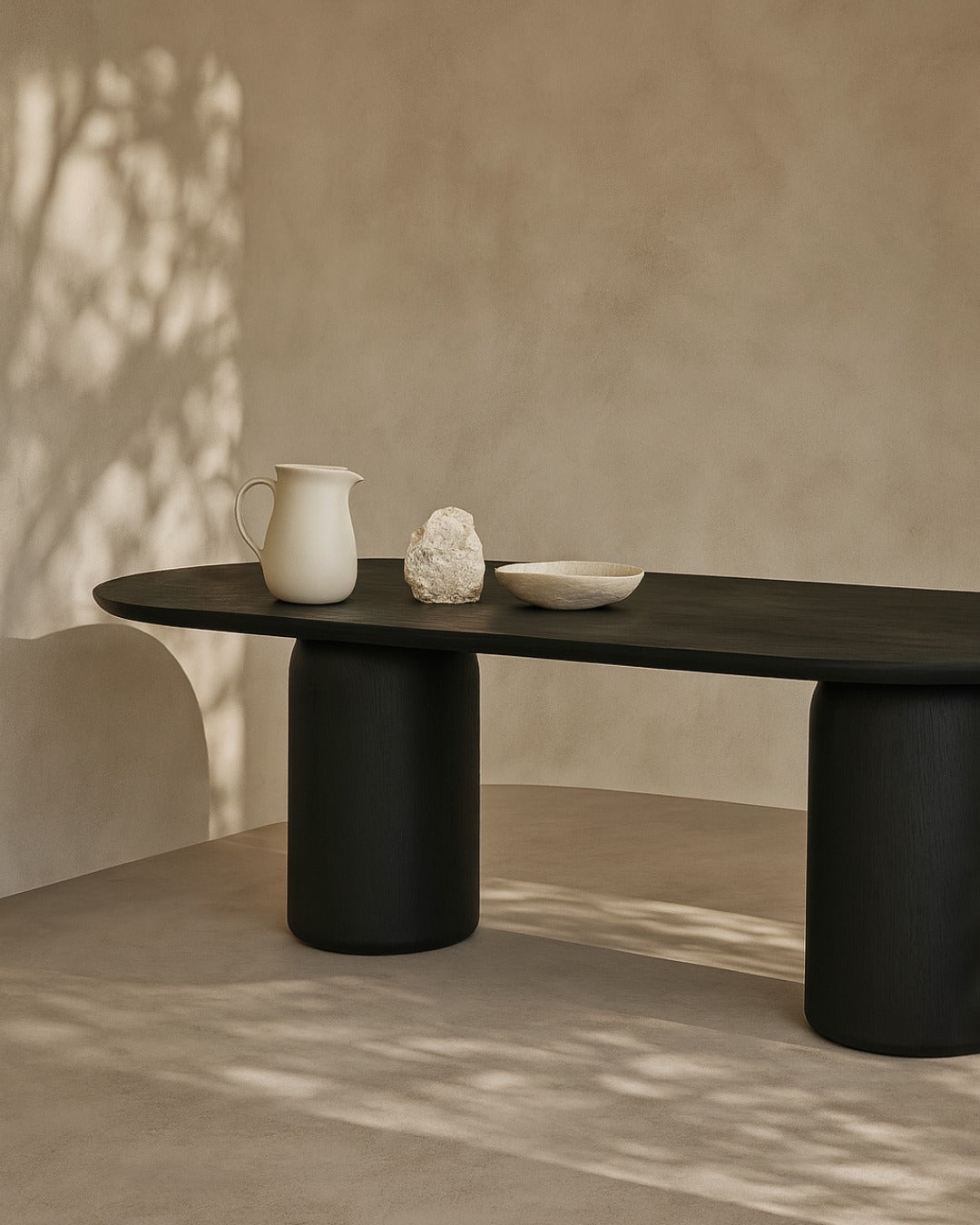 Designed with a smooth, rounded top and two strong cylindrical pedestal legs, it blends soft curves with solid presence, channelling minimalist and Scandinavian design influences. The matt black finish enhances the beauty of the wood grain, creating a powerful yet understated focal point. Generous in size, its inviting silhouette encourages conversation and connection.