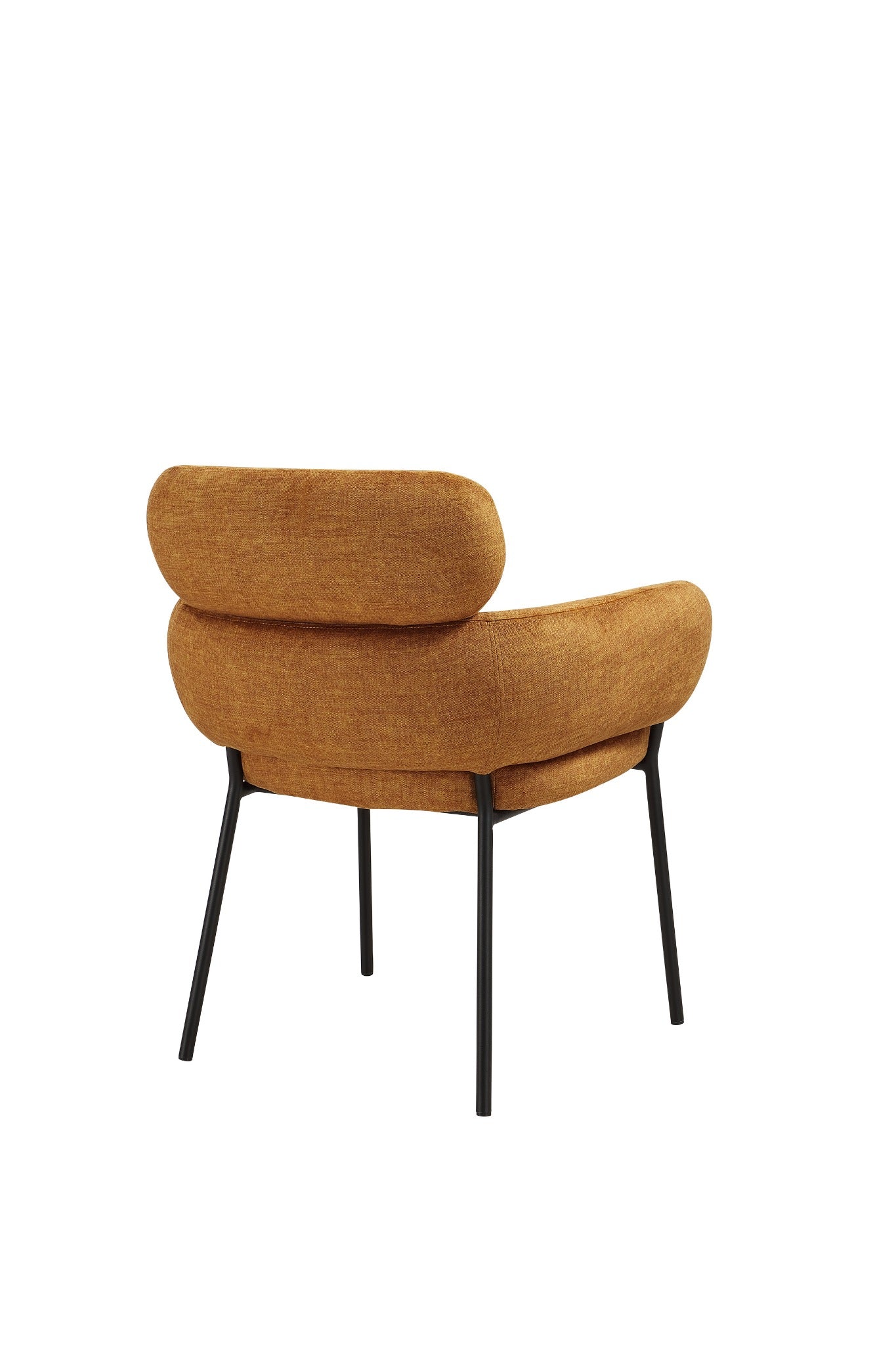 Defined by smooth, rounded curves and an easy, sculptural silhouette, it elevates dining spaces without sacrificing support. Soft amber upholstery delivers a versatile contemporary finish, while the ergonomic wraparound design features integrated arms and a padded headrest for a relaxed, lounge-like experience. Sleek black metal legs keep the profile light and refined, making it an effortless match for both minimalist and statement dining tables.
