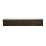 Made from a combination of recycled wood and oak veneer, it’s finished with a travertine-effect ceramic top that adds a luxurious, stone-like texture. The clean-lined design features three doors and two drawers, offering smart, concealed storage for media devices, accessories, and everyday clutter.